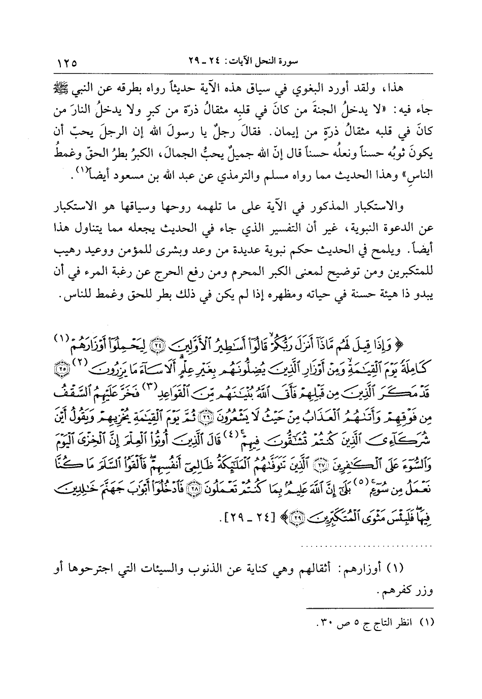 هذا، ولقد أورد البغوي في سياق هذه الآية حديثا رواه بطرقه عن النبي صلى الله عليه وسلم جاء فيه: «لا يدخل الجنة من كان في قلبه مثقال ذرّة من كبر ولا يدخل النار من كان في قلبه مثقال ذرّة من إيمان. فقال رجل يا رسول الله إن الرجل يحبّ أن يكون ثوبه حسنا ونعله حسنا قال إنّ الله جميل يحبّ الجمال، الكبر بطر الحقّ وغمط الناس» وهذا الحديث مما رواه مسلم والترمذي عن عبد الله بن مسعود أيضا «1» .