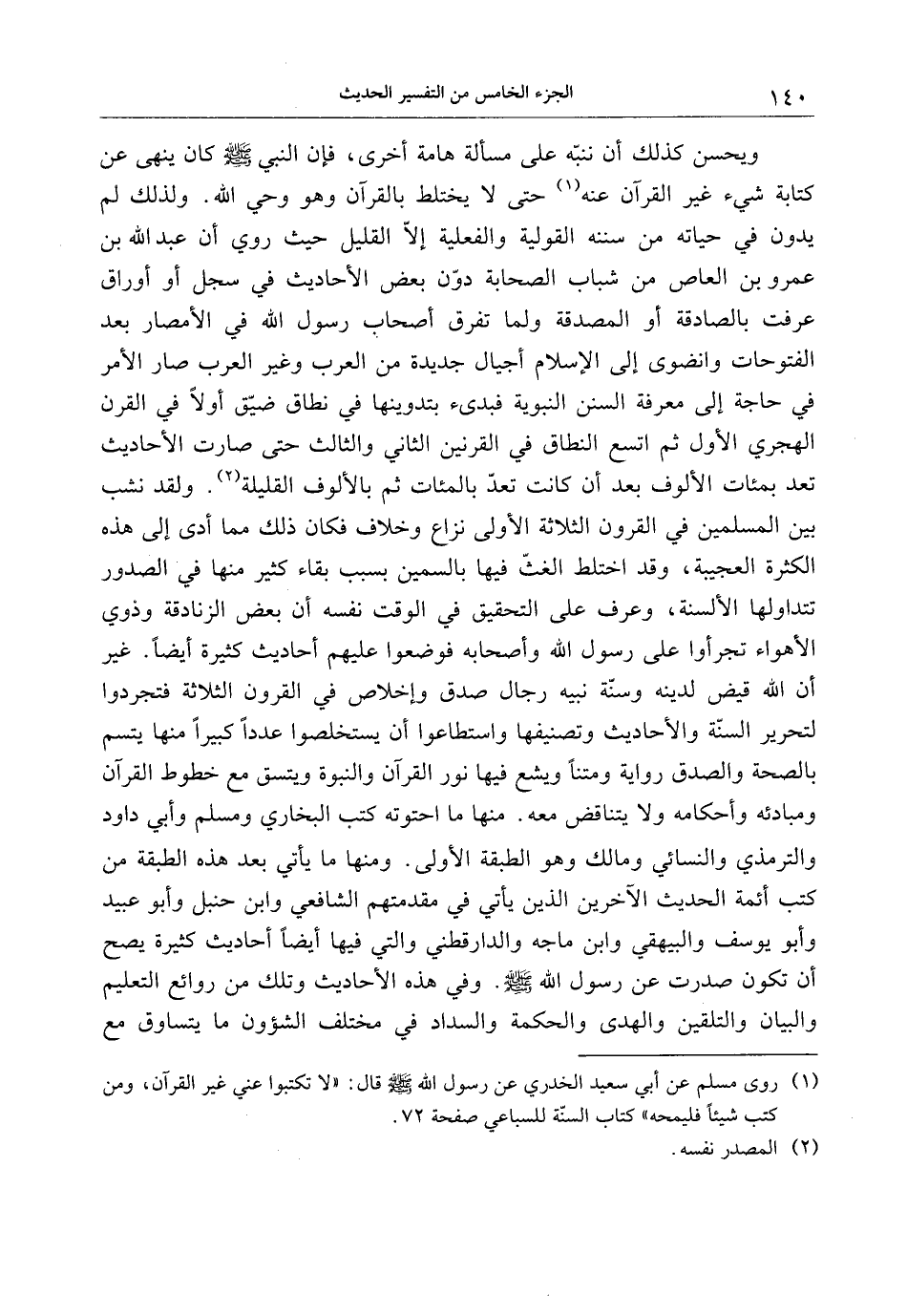 (1) روى مسلم عن أبي سعيد الخدري عن رسول الله صلى الله عليه وسلم قال: «لا تكتبوا عني غير القرآن، ومن كتب شيئا فليمحه» كتاب السنّة للسباعي صفحة 72.