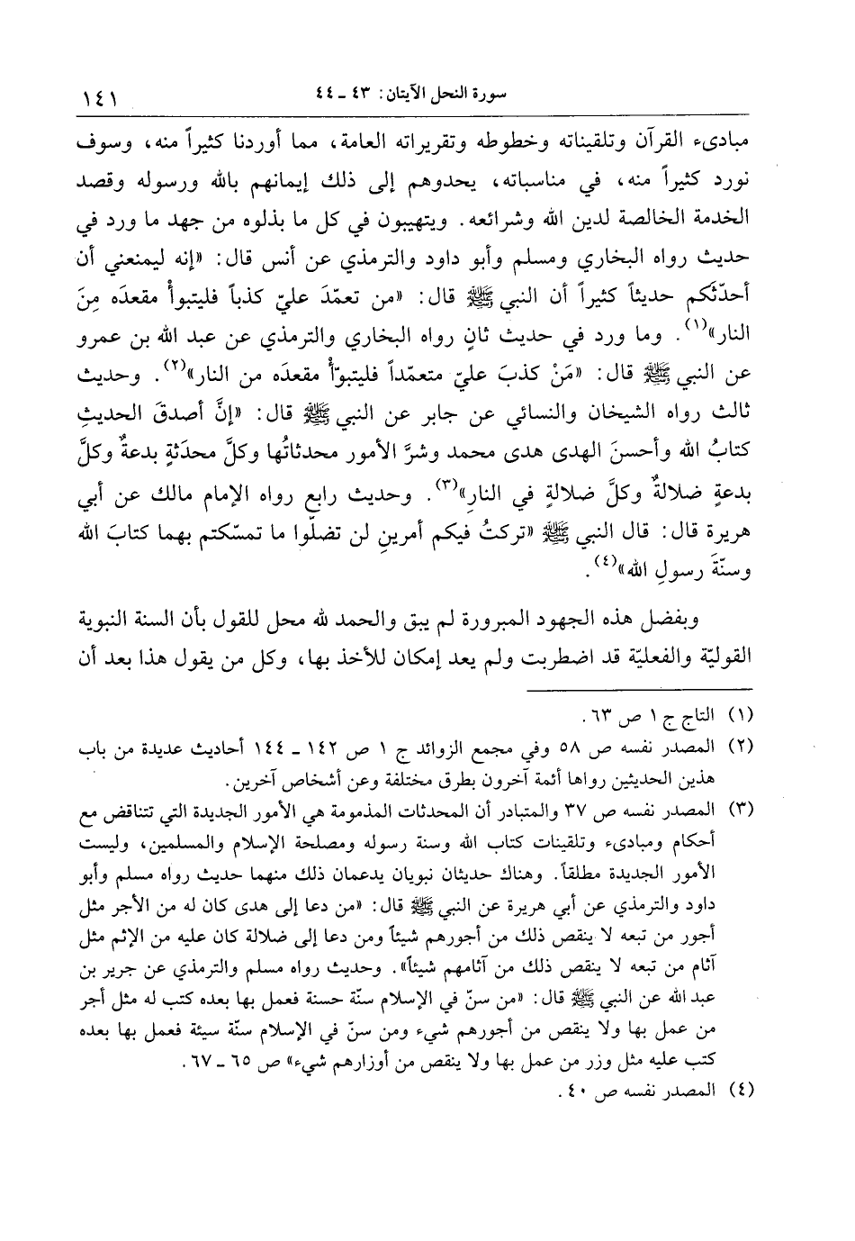 مبادئ القرآن وتلقيناته وخطوطه وتقريراته العامة، مما أوردنا كثيرا منه، وسوف نورد كثيرا منه، في مناسباته، يحدوهم إلى ذلك إيمانهم بالله ورسوله وقصد الخدمة الخالصة لدين الله وشرائعه. ويتهيبون في كل ما بذلوه من جهد ما ورد في حديث رواه البخاري ومسلم وأبو داود والترمذي عن أنس قال: «إنه ليمنعني أن أحدّثكم حديثا كثيرا أن النبي صلى الله عليه وسلم قال: «من تعمّد عليّ كذبا فليتبوأ مقعده من النار» «1» . وما ورد في حديث ثان رواه البخاري والترمذي عن عبد الله بن عمرو عن النبي صلى الله عليه وسلم قال: «من كذب عليّ متعمّدا فليتبوّا مقعده من النار» «2» . وحديث ثالث رواه الشيخان والنسائي عن جابر عن النبي صلى الله عليه وسلم قال: «إنّ أصدق الحديث كتاب الله وأحسن الهدى هدى محمد وشرّ الأمور محدثاتها وكلّ محدثة بدعة وكلّ بدعة ضلالة وكلّ ضلالة في النار» «3» . وحديث رابع رواه الإمام مالك عن أبي هريرة قال: قال النبي صلى الله عليه وسلم «تركت فيكم أمرين لن تضلّوا ما تمسّكتم بهما كتاب الله وسنّة رسول الله» «4» .