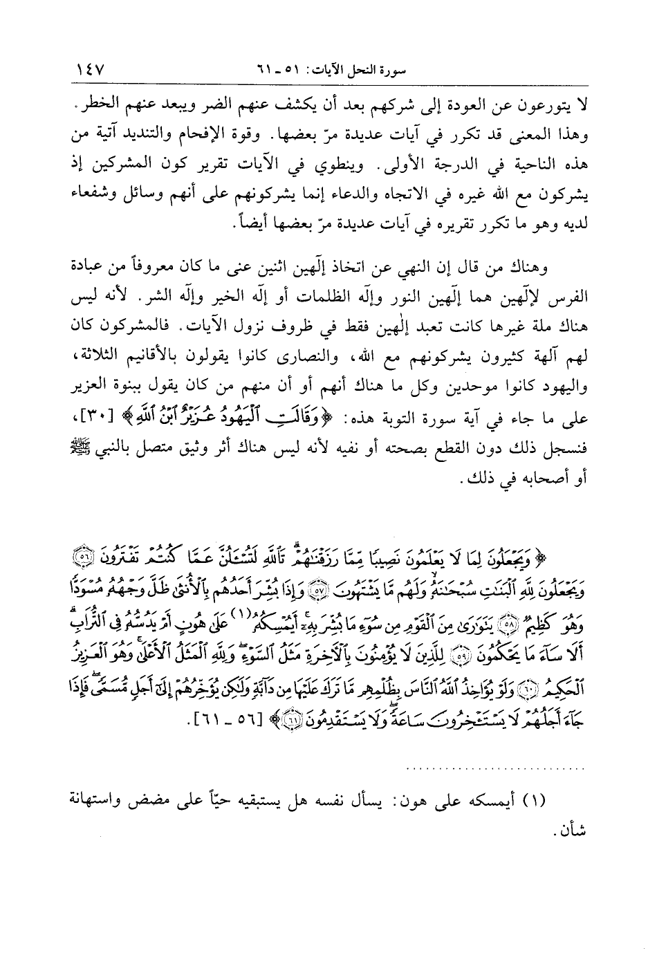 وَيَجْعَلُونَ لِما لا يَعْلَمُونَ نَصِيباً مِمَّا رَزَقْناهُمْ تَاللَّهِ لَتُسْئَلُنَّ عَمَّا كُنْتُمْ تَفْتَرُونَ (56) وَيَجْعَلُونَ لِلَّهِ الْبَناتِ سُبْحانَهُ وَلَهُمْ ما يَشْتَهُونَ (57) وَإِذا بُشِّرَ أَحَدُهُمْ بِالْأُنْثى ظَلَّ وَجْهُهُ مُسْوَدًّا وَهُوَ كَظِيمٌ (58) يَتَوارى مِنَ الْقَوْمِ مِنْ سُوءِ ما بُشِّرَ بِهِ أَيُمْسِكُهُ عَلى هُونٍ أَمْ يَدُسُّهُ فِي التُّرابِ أَلا ساءَ ما يَحْكُمُونَ (59) لِلَّذِينَ لا يُؤْمِنُونَ بِالْآخِرَةِ مَثَلُ السَّوْءِ وَلِلَّهِ الْمَثَلُ الْأَعْلى وَهُوَ الْعَزِيزُ الْحَكِيمُ (60)