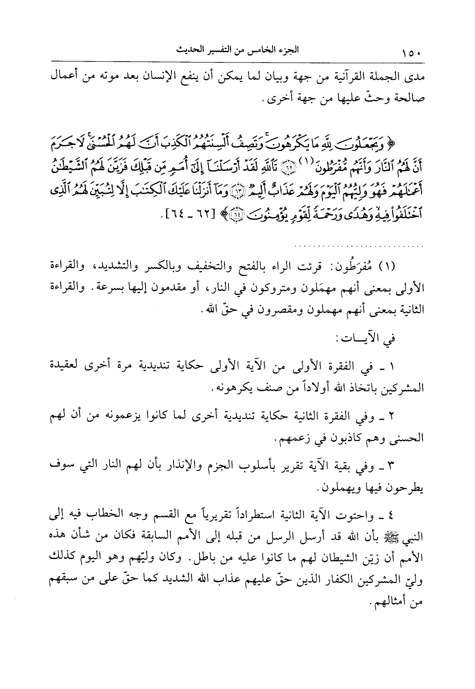 وَيَجْعَلُونَ لِلَّهِ ما يَكْرَهُونَ وَتَصِفُ أَلْسِنَتُهُمُ الْكَذِبَ أَنَّ لَهُمُ الْحُسْنى لا جَرَمَ أَنَّ لَهُمُ النَّارَ وَأَنَّهُمْ مُفْرَطُونَ (62) تَاللَّهِ لَقَدْ أَرْسَلْنا إِلى أُمَمٍ مِنْ قَبْلِكَ فَزَيَّنَ لَهُمُ الشَّيْطانُ أَعْمالَهُمْ فَهُوَ وَلِيُّهُمُ الْيَوْمَ وَلَهُمْ عَذابٌ أَلِيمٌ (63) وَما أَنْزَلْنا عَلَيْكَ الْكِتابَ إِلاَّ لِتُبَيِّنَ لَهُمُ الَّذِي اخْتَلَفُوا فِيهِ وَهُدىً وَرَحْمَةً لِقَوْمٍ يُؤْمِنُونَ (64)