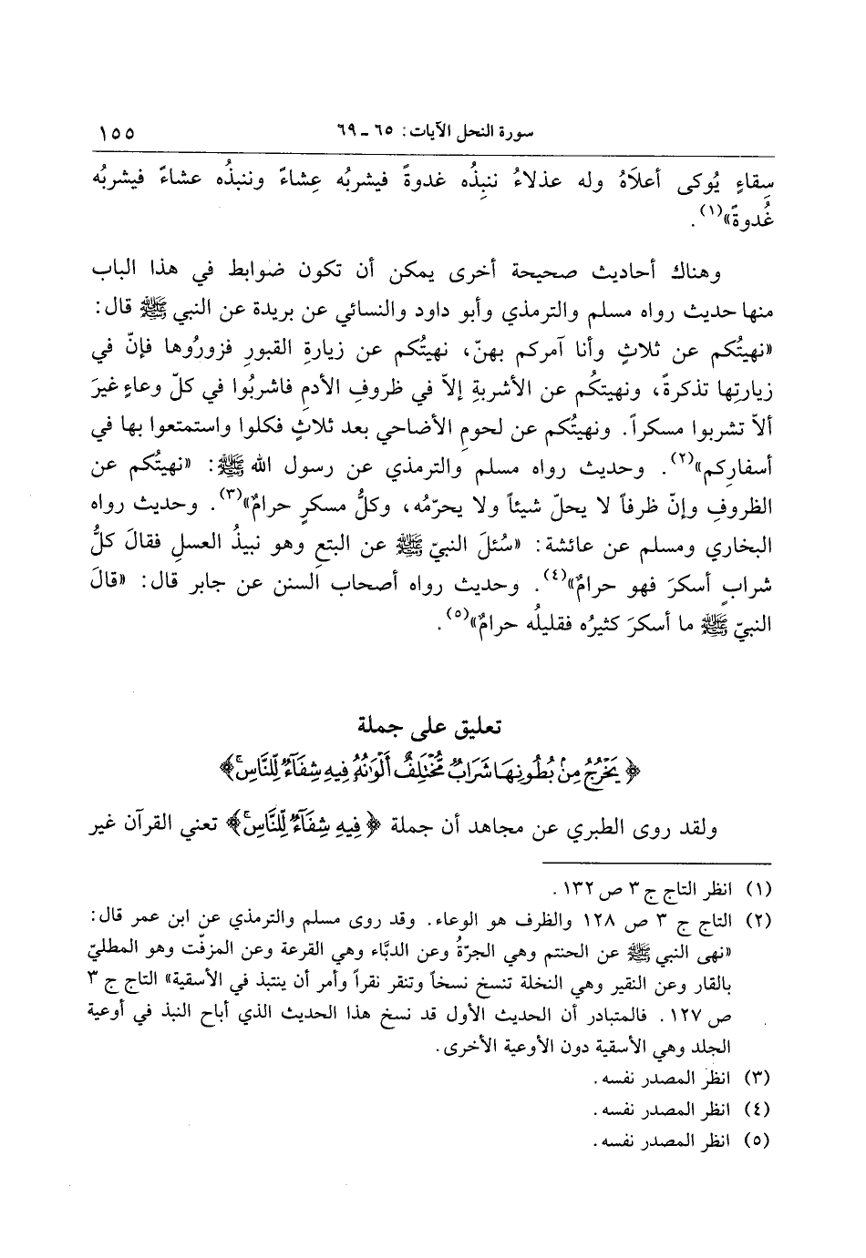 «نهيتكم عن ثلاث وأنا آمركم بهنّ، نهيتكم عن زيارة القبور فزوروها فإنّ في زيارتها تذكرة، ونهيتكم عن الأشربة إلّا في ظروف الأدم فاشربوا في كلّ وعاء غير ألّا تشربوا مسكرا. ونهيتكم عن لحوم الأضاحي بعد ثلاث فكلوا واستمتعوا بها في أسفاركم» «2» . وحديث رواه مسلم والترمذي عن رسول الله صلى الله عليه وسلم: «نهيتكم عن الظروف وإنّ ظرفا لا يحلّ شيئا ولا يحرّمه، وكلّ مسكر حرام» «3» . وحديث رواه البخاري ومسلم عن عائشة: «سئل النبيّ صلى الله عليه وسلم عن البتع وهو نبيذ العسل فقال كلّ شراب أسكر فهو حرام» «4» . وحديث رواه أصحاب السنن عن جابر قال: «قال النبيّ صلى الله عليه وسلم ما أسكر كثيرة فقليله حرام» «5» .