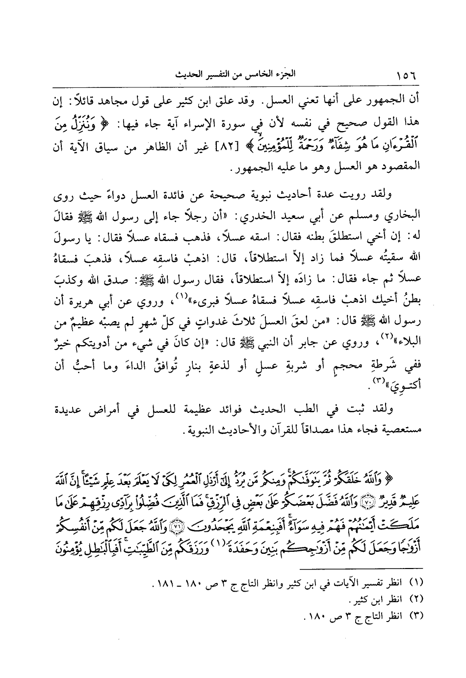 أن الجمهور على أنها تعني العسل. وقد علق ابن كثير على قول مجاهد قائلا: إن هذا القول صحيح في نفسه لأن في سورة الإسراء آية جاء فيها: وَنُنَزِّلُ مِنَ الْقُرْآنِ ما هُوَ شِفاءٌ وَرَحْمَةٌ لِلْمُؤْمِنِينَ [82] غير أن الظاهر من سياق الآية أن المقصود هو العسل وهو ما عليه الجمهور.