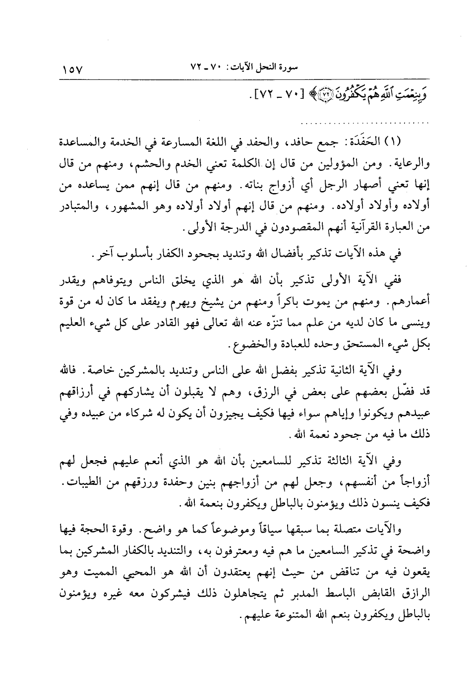 (1) الحفدة: جمع حافد، والحفد في اللغة المسارعة في الخدمة والمساعدة والرعاية. ومن المؤولين من قال إن الكلمة تعني الخدم والحشم، ومنهم من قال إنها تعني أصهار الرجل أي أزواج بناته. ومنهم من قال إنّهم ممن يساعده من أولاده وأولاد أولاده. ومنهم من قال إنهم أولاد أولاده وهو المشهور، والمتبادر من العبارة القرآنية أنهم المقصودون في الدرجة الأولى.
