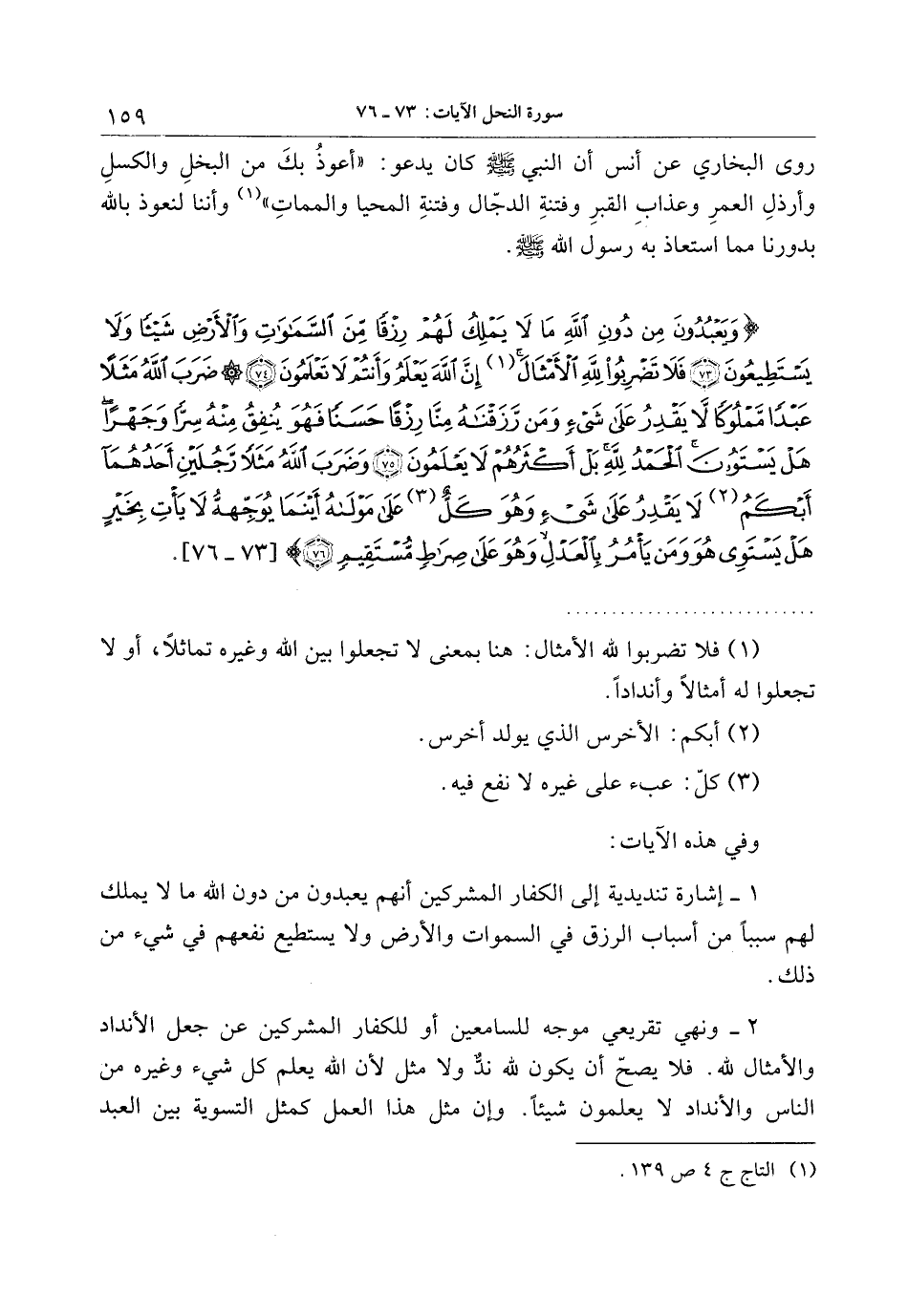 وَيَعْبُدُونَ مِنْ دُونِ اللَّهِ ما لا يَمْلِكُ لَهُمْ رِزْقاً مِنَ السَّماواتِ وَالْأَرْضِ شَيْئاً وَلا يَسْتَطِيعُونَ (73) فَلا تَضْرِبُوا لِلَّهِ الْأَمْثالَ إِنَّ اللَّهَ يَعْلَمُ وَأَنْتُمْ لا تَعْلَمُونَ (74) ضَرَبَ اللَّهُ مَثَلاً عَبْداً مَمْلُوكاً لا يَقْدِرُ عَلى شَيْءٍ وَمَنْ رَزَقْناهُ مِنَّا رِزْقاً حَسَناً فَهُوَ يُنْفِقُ مِنْهُ سِرًّا وَجَهْراً هَلْ يَسْتَوُونَ الْحَمْدُ لِلَّهِ بَلْ أَكْثَرُهُمْ لا يَعْلَمُونَ (75) وَضَرَبَ اللَّهُ مَثَلاً رَجُلَيْنِ أَحَدُهُما أَبْكَمُ لا يَقْدِرُ عَلى شَيْءٍ وَهُوَ كَلٌّ عَلى مَوْلاهُ أَيْنَما يُوَجِّهْهُ لا يَأْتِ بِخَيْرٍ هَلْ يَسْتَوِي هُوَ وَمَنْ يَأْمُرُ بِالْعَدْلِ وَهُوَ عَلى صِراطٍ مُسْتَقِيمٍ (76)