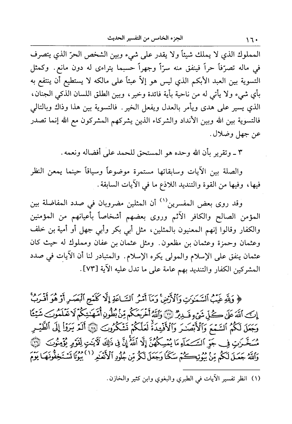 المملوك الذي لا يملك شيئا ولا يقدر على شيء وبين الشخص الحرّ الذي يتصرف في ماله تصرّفا حرا فينفق منه سرّا وجهرا حسبما يتراءى له دون مانع. وكمثل التسوية بين العبد الأبكم الذي ليس هو إلّا عبئا على مالكه لا يستطيع أن ينتفع به بأي شيء ولا يأتي له من ناحية بأية فائدة وخير، وبين الطلق اللسان الذكي الجنان، الذي يسير على هدى ويأمر بالعدل ويفعل الخير. فالتسوية بين هذا وذاك وبالتالي فالتسوية بين الله وبين الأنداد والشركاء الذين يشركهم المشركون مع الله إنما تصدر عن جهل وضلال.