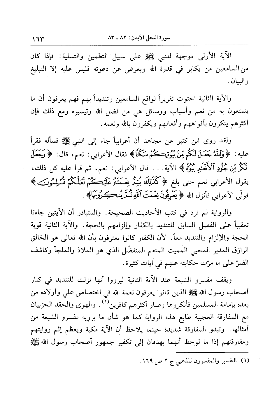 ويقف مفسرو الشيعة عند الآية الثانية ليرووا أنها نزلت للتنديد في كبار أصحاب رسول الله صلى الله عليه وسلم الذين كانوا يعرفون نعمة الله في اختصاص علي وأولاده من بعده بإمامة المسلمين فأنكروها وصار أكثرهم كافرين «1» . والهوى والحقد الحزبيان مع المفارقة العجيبة طابع هذه الرواية كما هو شأن ما يرويه مفسرو الشيعة من أمثالها. وتبدو المفارقة شديدة حينما يلاحظ أن الآية مكية ويعظم إثم روايتهم ومفارقتهم إذا ما لوحظ أنهما يهدفان إلى تكفير جمهور أصحاب رسول الله صلى الله عليه وسلم