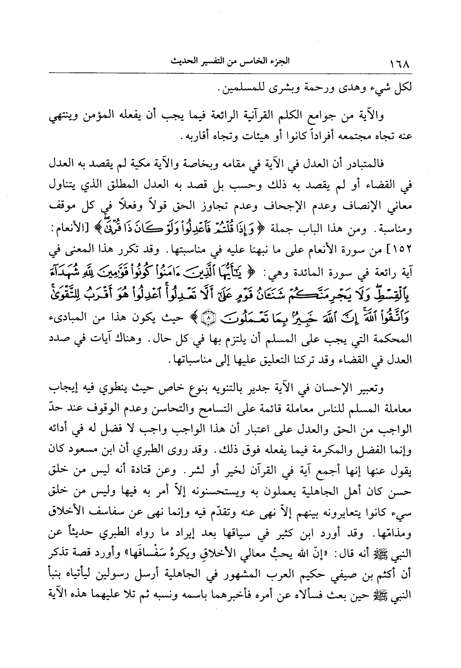 152] من سورة الأنعام على ما نبهنا عليه في مناسبتها. وقد تكرر هذا المعنى في آية رائعة في سورة المائدة وهي: يا أَيُّهَا الَّذِينَ آمَنُوا كُونُوا قَوَّامِينَ لِلَّهِ شُهَداءَ بِالْقِسْطِ وَلا يَجْرِمَنَّكُمْ شَنَآنُ قَوْمٍ عَلى أَلَّا تَعْدِلُوا اعْدِلُوا هُوَ أَقْرَبُ لِلتَّقْوى وَاتَّقُوا اللَّهَ إِنَّ اللَّهَ خَبِيرٌ بِما تَعْمَلُونَ (8) حيث يكون هذا من المبادئ المحكمة التي يجب على المسلم أن يلتزم بها في كل حال. وهناك آيات في صدد العدل في القضاء وقد تركنا التعليق عليها إلى مناسباتها.