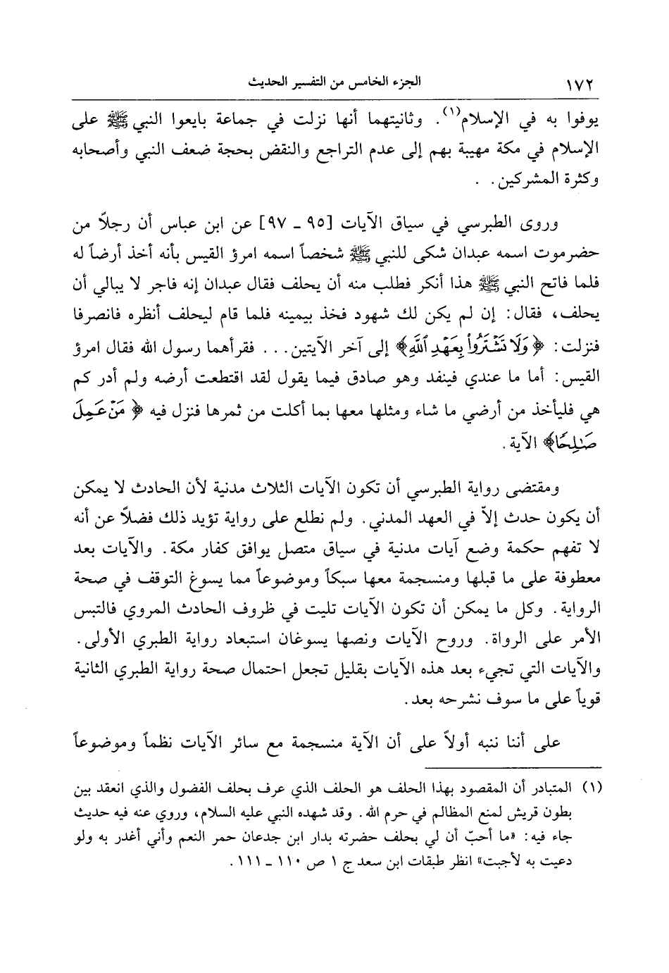 ومقتضى رواية الطبرسي أن تكون الآيات الثلاث مدنية لأن الحادث لا يمكن أن يكون حدث إلّا في العهد المدني. ولم نطلع على رواية تؤيد ذلك فضلا عن أنه لا تفهم حكمة وضع آيات مدنية في سياق متصل يوافق كفار مكة. والآيات بعد معطوفة على ما قبلها ومنسجمة معها سبكا وموضوعا مما يسوغ التوقف في صحة الرواية. وكل ما يمكن أن تكون الآيات تليت في ظروف الحادث المروي فالتبس الأمر على الرواة. وروح الآيات ونصها يسوغان استبعاد رواية الطبري الأولى.