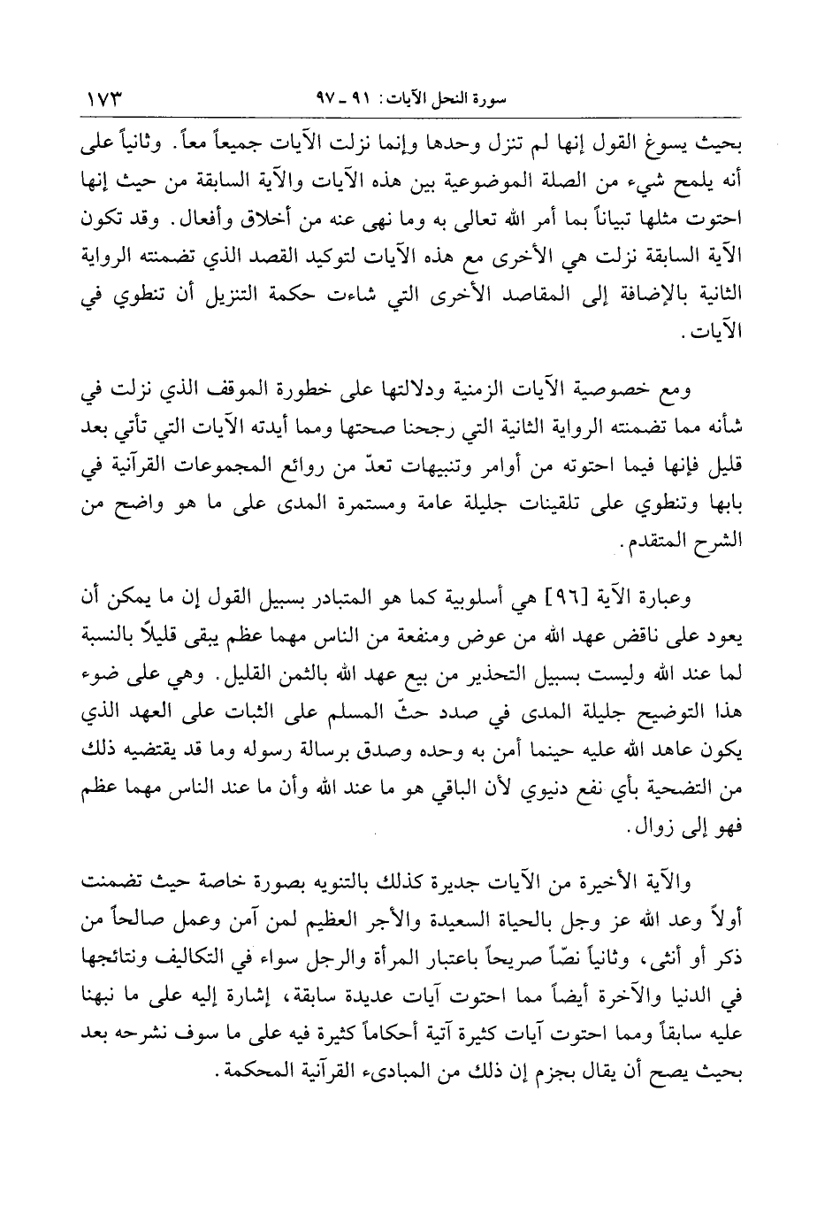 وعبارة الآية [96] هي أسلوبية كما هو المتبادر بسبيل القول إن ما يمكن أن يعود على ناقض عهد الله من عوض ومنفعة من الناس مهما عظم يبقى قليلا بالنسبة لما عند الله وليست بسبيل التحذير من بيع عهد الله بالثمن القليل. وهي على ضوء هذا التوضيح جليلة المدى في صدد حثّ المسلم على الثبات على العهد الذي يكون عاهد الله عليه حينما أمن به وحده وصدق برسالة رسوله وما قد يقتضيه ذلك من التضحية بأي نفع دنيوي لأن الباقي هو ما عند الله وأن ما عند الناس مهما عظم فهو إلى زوال.