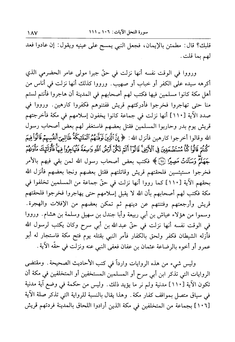 وليس شيء من هذه الروايات واردا في كتب الأحاديث الصحيحة. ومقتضى الروايات التي تذكر ابن أبي سرح أو المسلمين المستخفين أو المتخلفين في مكة أن تكون الآية [110] مدنية ولم نر ما يؤيد ذلك. وليس من حكمة في وضع آية مدنية في سياق متصل بمواقف كفار مكة. وهذا يقال بالنسبة للرواية التي تذكر صلة الآية [106] بجماعة من المتخلفين في مكة الذين أرادوا اللحاق بالمدينة فردتهم قريش