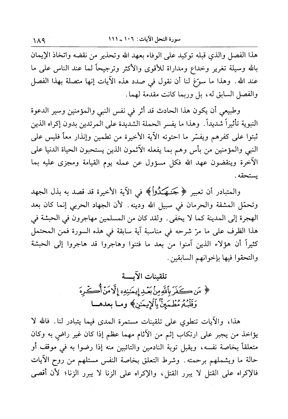تلقينات الآية مَنْ كَفَرَ بِاللَّهِ مِنْ بَعْدِ إِيمانِهِ إِلَّا مَنْ أُكْرِهَ وَقَلْبُهُ مُطْمَئِنٌّ بِالْإِيمانِ وما بعدها