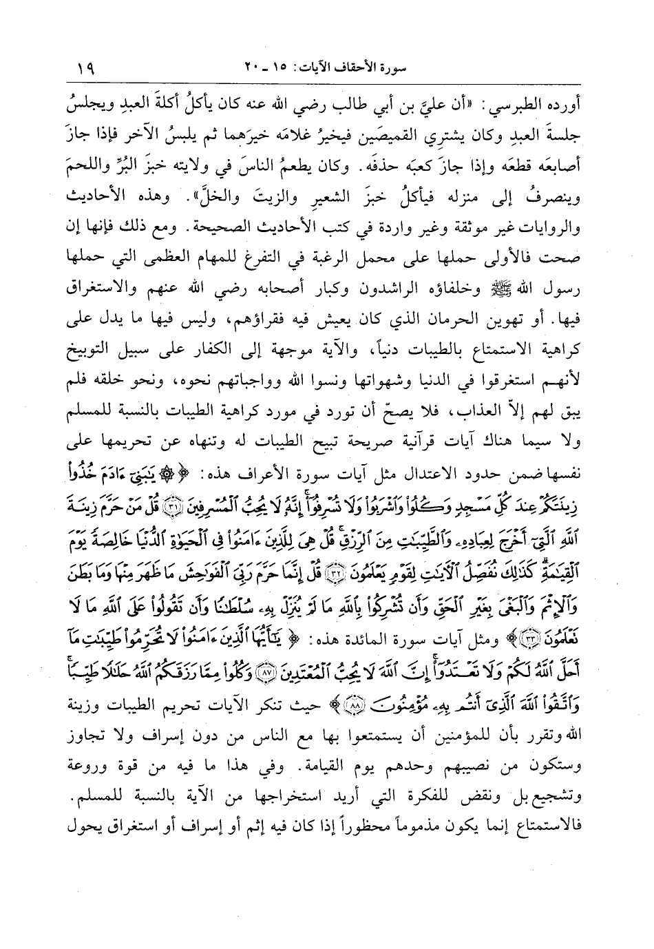 أورده الطبرسي: «أن عليّ بن أبي طالب رضي الله عنه كان يأكل أكلة العبد ويجلس جلسة العبد وكان يشتري القميصين فيخير غلامه خيرهما ثم يلبس الآخر فإذا جاز أصابعه قطعه وإذا جاز كعبه حذفه. وكان يطعم الناس في ولايته خبز البرّ واللحم وينصرف إلى منزله فيأكل خبز الشعير والزيت والخلّ» . وهذه الأحاديث والروايات غير موثقة وغير واردة في كتب الأحاديث الصحيحة. ومع ذلك فإنها إن صحت فالأولى حملها على محمل الرغبة في التفرغ للمهام العظمى التي حملها رسول الله صلى الله عليه وسلم وخلفاؤه الراشدون وكبار أصحابه رضي الله عنهم والاستغراق فيها. أو تهوين الحرمان الذي كان يعيش فيه فقراؤهم، وليس فيها ما يدل على كراهية الاستمتاع بالطيبات دنيا، والآية موجهة إلى الكفار على سبيل التوبيخ لأنهم استغرقوا في الدنيا وشهواتها ونسوا الله وواجباتهم نحوه، ونحو خلقه فلم يبق لهم إلّا العذاب، فلا يصحّ أن تورد في مورد كراهية الطيبات بالنسبة للمسلم ولا سيما هناك آيات قرآنية صريحة تبيح الطيبات له وتنهاه عن تحريمها على نفسها ضمن حدود الاعتدال مثل آيات سورة الأعراف هذه: يا بَنِي آدَمَ خُذُوا زِينَتَكُمْ عِنْدَ كُلِّ مَسْجِدٍ وَكُلُوا وَاشْرَبُوا وَلا تُسْرِفُوا إِنَّهُ لا يُحِبُّ الْمُسْرِفِينَ (31) قُلْ مَنْ حَرَّمَ زِينَةَ اللَّهِ الَّتِي أَخْرَجَ لِعِبادِهِ وَالطَّيِّباتِ مِنَ الرِّزْقِ قُلْ هِيَ لِلَّذِينَ آمَنُوا فِي الْحَياةِ الدُّنْيا خالِصَةً يَوْمَ الْقِيامَةِ كَذلِكَ نُفَصِّلُ الْآياتِ لِقَوْمٍ يَعْلَمُونَ (32) قُلْ إِنَّما حَرَّمَ رَبِّيَ الْفَواحِشَ ما ظَهَرَ مِنْها وَما بَطَنَ وَالْإِثْمَ وَالْبَغْيَ بِغَيْرِ الْحَقِّ وَأَنْ تُشْرِكُوا بِاللَّهِ ما لَمْ يُنَزِّلْ بِهِ سُلْطاناً وَأَنْ تَقُولُوا عَلَى اللَّهِ ما لا تَعْلَمُونَ (33) ومثل آيات سورة المائدة هذه: يا أَيُّهَا الَّذِينَ آمَنُوا لا تُحَرِّمُوا طَيِّباتِ ما أَحَلَّ اللَّهُ لَكُمْ وَلا تَعْتَدُوا إِنَّ اللَّهَ لا يُحِبُّ الْمُعْتَدِينَ (87) وَكُلُوا مِمَّا رَزَقَكُمُ اللَّهُ حَلالًا طَيِّباً وَاتَّقُوا اللَّهَ الَّذِي أَنْتُمْ بِهِ مُؤْمِنُونَ (88) حيث تنكر الآيات تحريم الطيبات وزينة الله وتقرر بأن للمؤمنين أن يستمتعوا بها مع الناس من دون إسراف ولا تجاوز وستكون من نصيبهم وحدهم يوم القيامة. وفي هذا ما فيه من قوة وروعة وتشجيع بل ونقض للفكرة التي أريد استخراجها من الآية بالنسبة للمسلم.