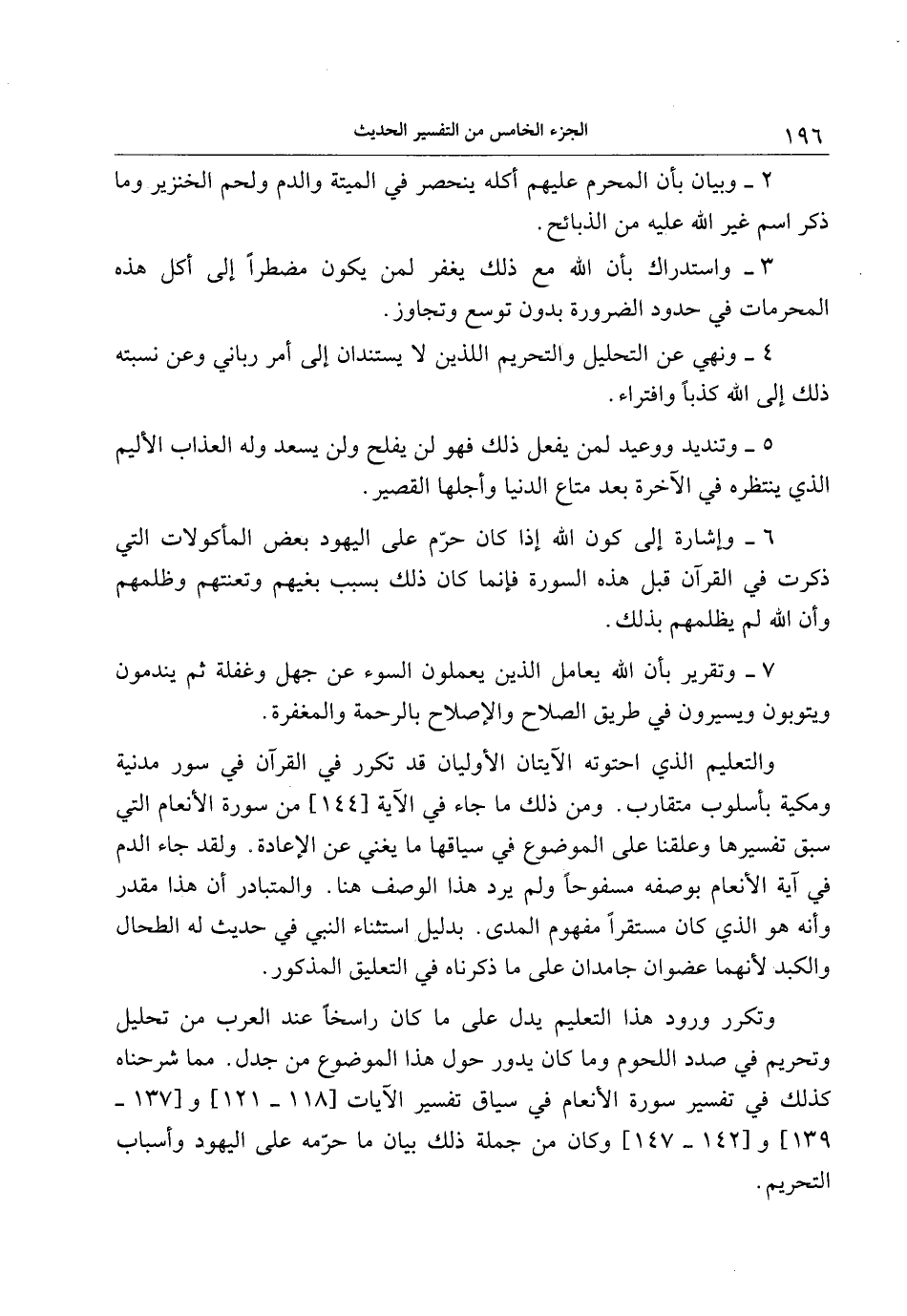 وتكرر ورود هذا التعليم يدل على ما كان راسخا عند العرب من تحليل وتحريم في صدد اللحوم وما كان يدور حول هذا الموضوع من جدل. مما شرحناه كذلك في تفسير سورة الأنعام في سياق تفسير الآيات [118- 121] و [137- 139] و [142- 147] وكان من جملة ذلك بيان ما حرّمه على اليهود وأسباب التحريم.