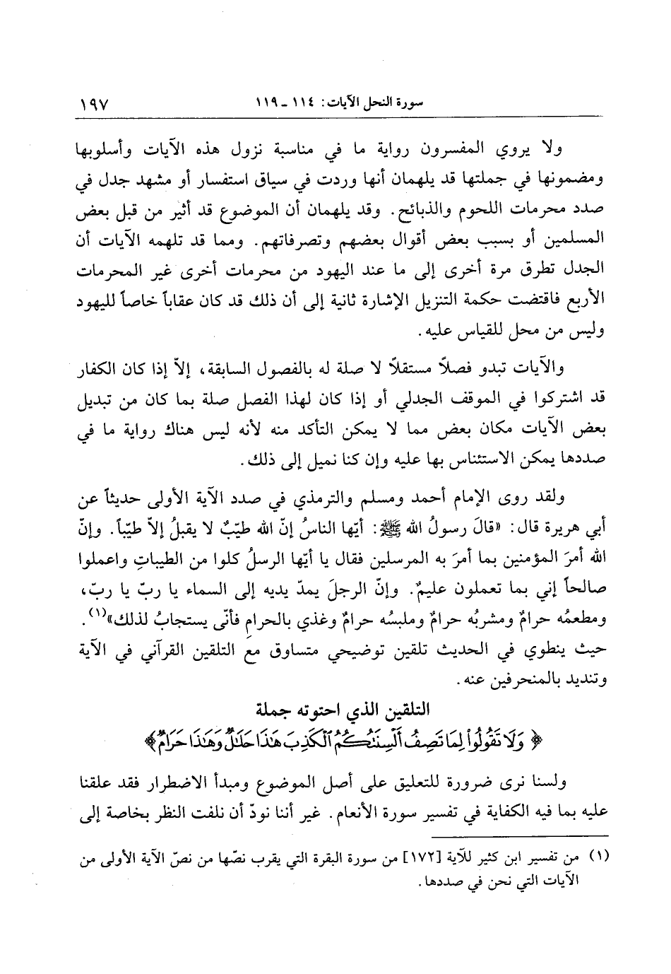 ولسنا نرى ضرورة للتعليق على أصل الموضوع ومبدأ الاضطرار فقد علقنا عليه بما فيه الكفاية في تفسير سورة الأنعام. غير أننا نودّ أن نلفت النظر بخاصة إلى