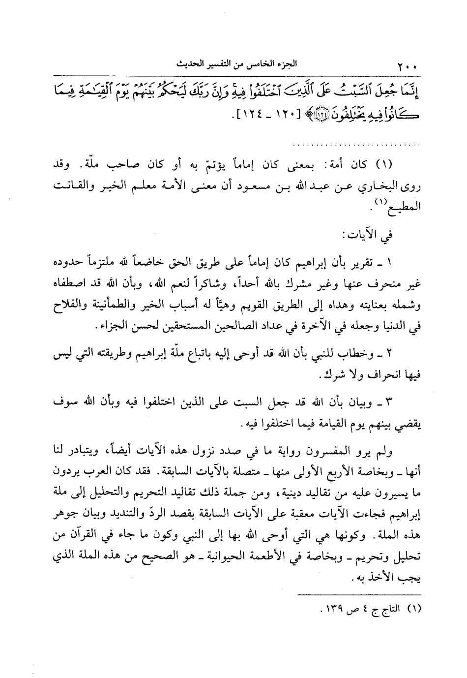 ولم يرو المفسرون رواية ما في صدد نزول هذه الآيات أيضا، ويتبادر لنا أنها- وبخاصة الأربع الأولى منها- متصلة بالآيات السابقة. فقد كان العرب يردون ما يسيرون عليه من تقاليد دينية، ومن جملة ذلك تقاليد التحريم والتحليل إلى ملة إبراهيم فجاءت الآيات معقبة على الآيات السابقة بقصد الردّ والتنديد وبيان جوهر هذه الملة. وكونها هي التي أوحى الله بها إلى النبي وكون ما جاء في القرآن من تحليل وتحريم- وبخاصة في الأطعمة الحيوانية- هو الصحيح من هذه الملة الذي يجب الأخذ به.