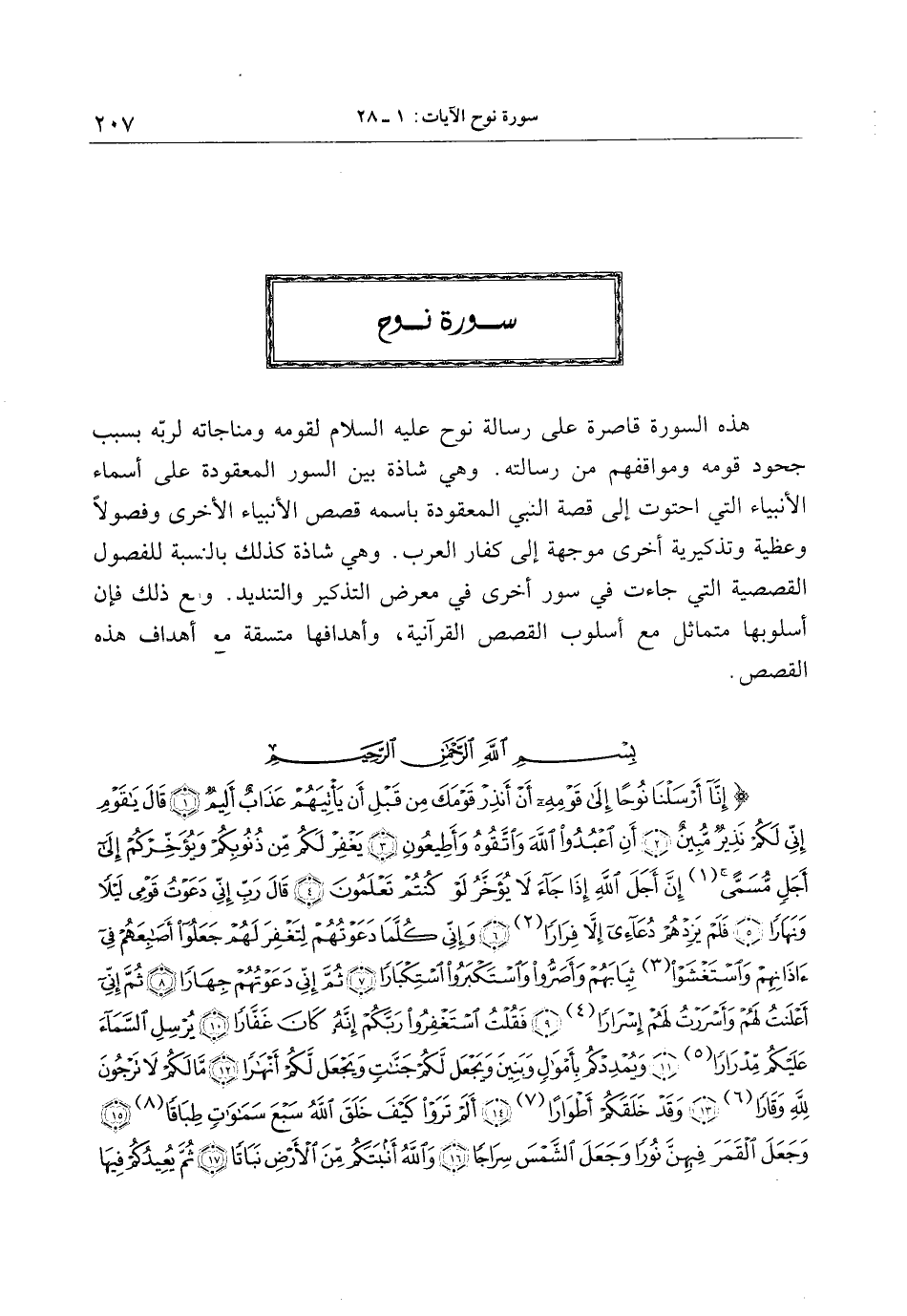 إِنَّا أَرْسَلْنا نُوحاً إِلى قَوْمِهِ أَنْ أَنْذِرْ قَوْمَكَ مِنْ قَبْلِ أَنْ يَأْتِيَهُمْ عَذابٌ أَلِيمٌ (1) قالَ يا قَوْمِ إِنِّي لَكُمْ نَذِيرٌ مُبِينٌ (2) أَنِ اعْبُدُوا اللَّهَ وَاتَّقُوهُ وَأَطِيعُونِ (3) يَغْفِرْ لَكُمْ مِنْ ذُنُوبِكُمْ وَيُؤَخِّرْكُمْ إِلى أَجَلٍ مُسَمًّى إِنَّ أَجَلَ اللَّهِ إِذا جاءَ لا يُؤَخَّرُ لَوْ كُنْتُمْ تَعْلَمُونَ (4)