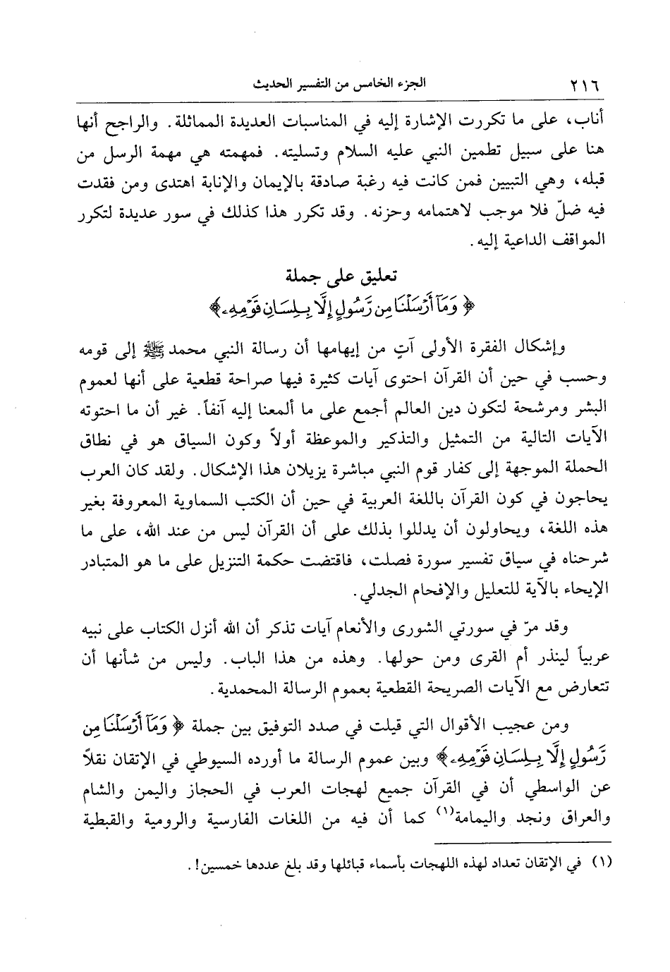 تعليق على جملة وَما أَرْسَلْنا مِنْ رَسُولٍ إِلَّا بِلِسانِ قَوْمِهِ