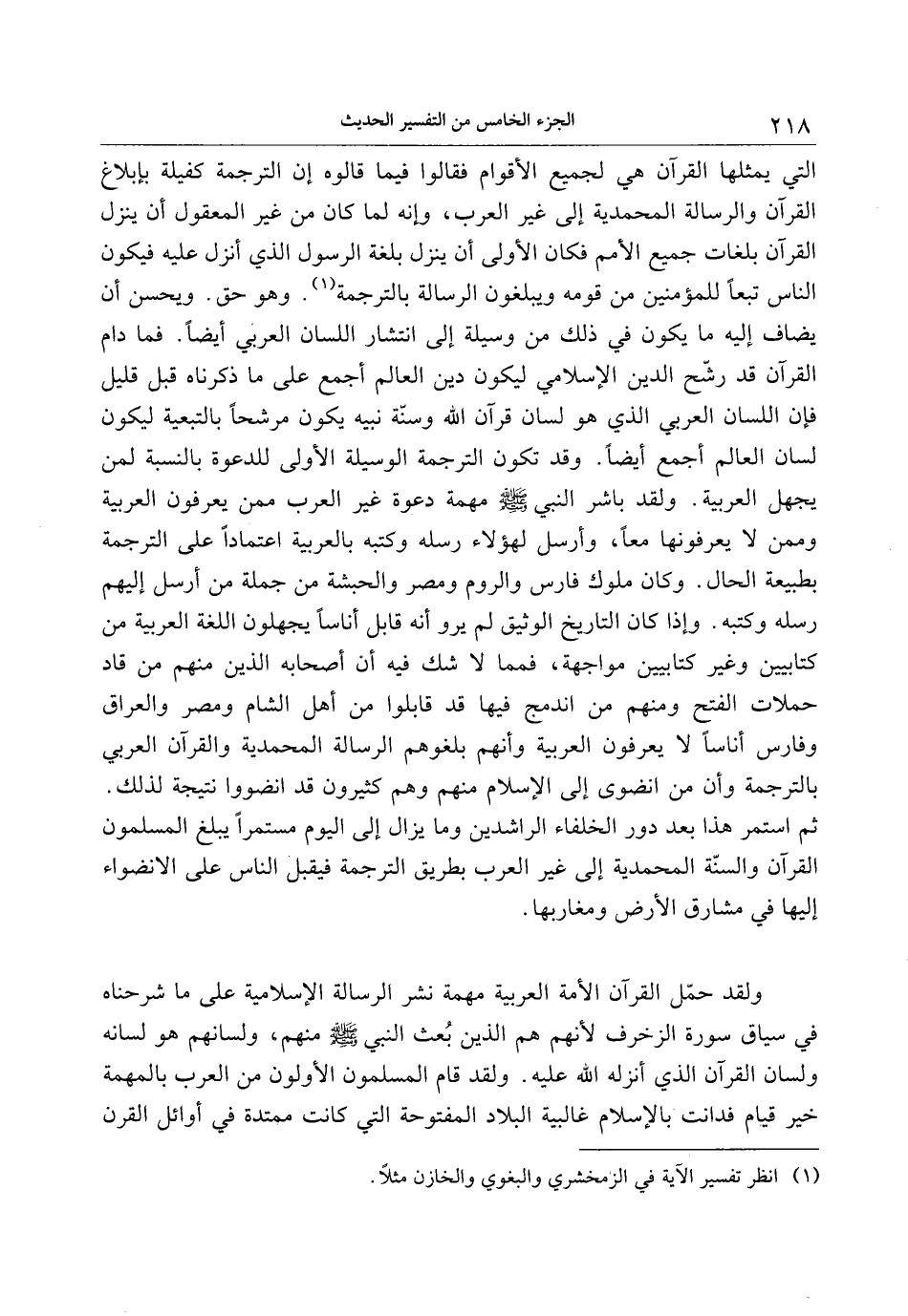 التي يمثلها القرآن هي لجميع الأقوام فقالوا فيما قالوه إن الترجمة كفيلة بإبلاغ القرآن والرسالة المحمدية إلى غير العرب، وإنه لما كان من غير المعقول أن ينزل القرآن بلغات جميع الأمم فكان الأولى أن ينزل بلغة الرسول الذي أنزل عليه فيكون الناس تبعا للمؤمنين من قومه ويبلغون الرسالة بالترجمة «1» . وهو حق. ويحسن أن يضاف إليه ما يكون في ذلك من وسيلة إلى انتشار اللسان العربي أيضا. فما دام القرآن قد رشّح الدين الإسلامي ليكون دين العالم أجمع على ما ذكرناه قبل قليل فإن اللسان العربي الذي هو لسان قرآن الله وسنّة نبيه يكون مرشحا بالتبعية ليكون لسان العالم أجمع أيضا. وقد تكون الترجمة الوسيلة الأولى للدعوة بالنسبة لمن يجهل العربية. ولقد باشر النبي صلى الله عليه وسلم مهمة دعوة غير العرب ممن يعرفون العربية وممن لا يعرفونها معا، وأرسل لهؤلاء رسله وكتبه بالعربية اعتمادا على الترجمة بطبيعة الحال. وكان ملوك فارس والروم ومصر والحبشة من جملة من أرسل إليهم رسله وكتبه. وإذا كان التاريخ الوثيق لم يرو أنه قابل أناسا يجهلون اللغة العربية من كتابيين وغير كتابيين مواجهة، فمما لا شك فيه أن أصحابه الذين منهم من قاد حملات الفتح ومنهم من اندمج فيها قد قابلوا من أهل الشام ومصر والعراق وفارس أناسا لا يعرفون العربية وأنهم بلغوهم الرسالة المحمدية والقرآن العربي بالترجمة وأن من انضوى إلى الإسلام منهم وهم كثيرون قد انضووا نتيجة لذلك.