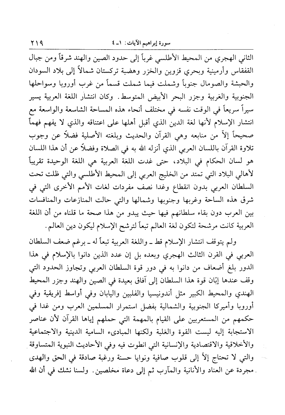 ولم يتوقف انتشار الإسلام قط- واللغة العربية تبعا له- برغم ضعف السلطان العربي في القرن الثالث الهجري وبعده بل إن عدد الذين دانوا بالإسلام في هذا الدور بلغ أضعاف من دانوا به في دور قوة السلطان العربي وتجاوز الحدود التي وقف عندها إبّان قوة هذا السلطان إلى آفاق بعيدة في الصين والهند وجزر المحيط الهندي والمحيط الكبير مثل أندونيسيا والفلبين واليابان وفي أواسط إفريقية وفي أوروبا وأميركا الجنوبية والشمالية بفضل استمرار المسلمين العرب ومن غدا في حكمهم من المستعربين على القيام بالمهمة التي حملهم إياها القرآن لأن عناصر الاستجابة إليه ليست القوة والغلبة ولكنها المبادئ السامية الدينية والاجتماعية والأخلاقية والاقتصادية والإنسانية التي انطوت فيه وفي الأحاديث النبوية المتساوقة والتي لا تحتاج إلّا إلى قلوب صافية ونوايا حسنة ورغبة صادقة في الحق والهدى مجردة عن العناد والأنانية والمآرب ثم إلى دعاة مخلصين. ولسنا نشك في أن الله