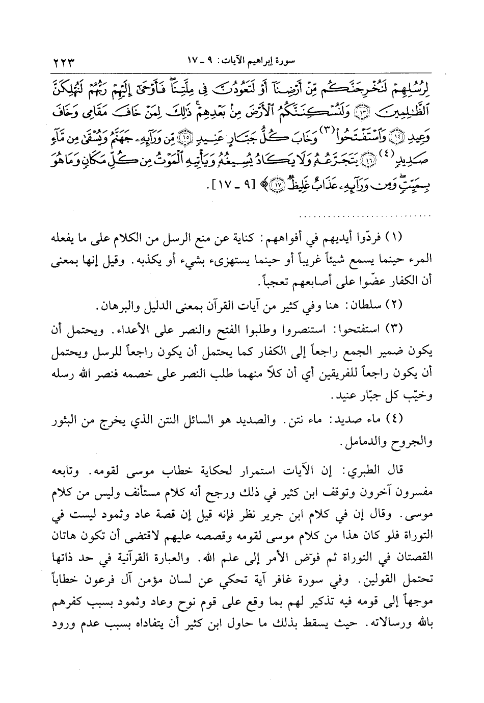 (1) فردّوا أيديهم في أفواههم: كناية عن منع الرسل من الكلام على ما يفعله المرء حينما يسمع شيئا غريبا أو حينما يستهزىء بشيء أو يكذبه. وقيل إنها بمعنى أن الكفار عضّوا على أصابعهم تعجبا.