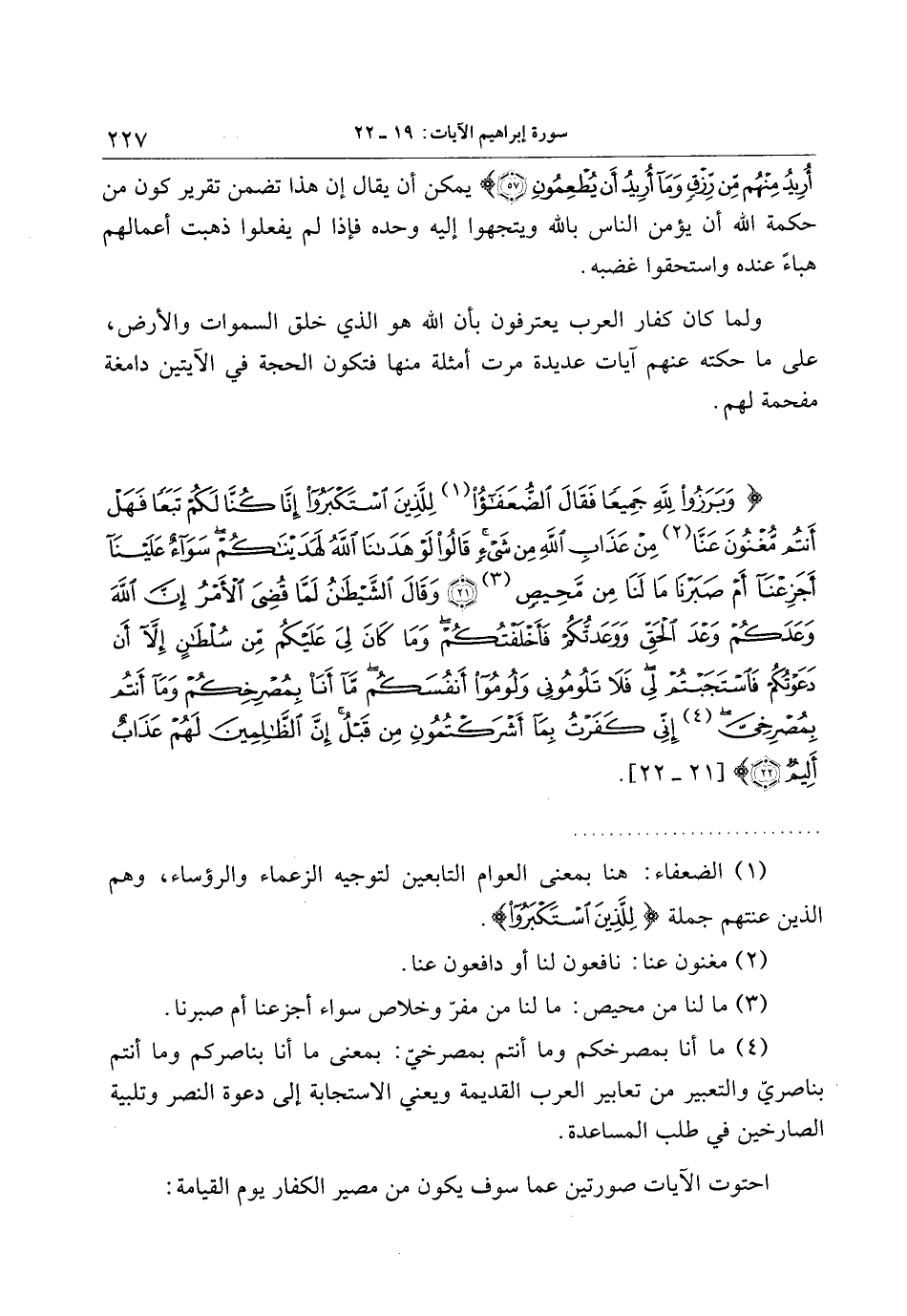 وَبَرَزُوا لِلَّهِ جَمِيعاً فَقالَ الضُّعَفاءُ لِلَّذِينَ اسْتَكْبَرُوا إِنَّا كُنَّا لَكُمْ تَبَعاً فَهَلْ أَنْتُمْ مُغْنُونَ عَنَّا مِنْ عَذابِ اللَّهِ مِنْ شَيْءٍ قالُوا لَوْ هَدانَا اللَّهُ لَهَدَيْناكُمْ سَواءٌ عَلَيْنا أَجَزِعْنا أَمْ صَبَرْنا ما لَنا مِنْ مَحِيصٍ (21) وَقالَ الشَّيْطانُ لَمَّا قُضِيَ الْأَمْرُ إِنَّ اللَّهَ وَعَدَكُمْ وَعْدَ الْحَقِّ وَوَعَدْتُكُمْ فَأَخْلَفْتُكُمْ وَما كانَ لِي عَلَيْكُمْ مِنْ سُلْطانٍ إِلاَّ أَنْ دَعَوْتُكُمْ فَاسْتَجَبْتُمْ لِي فَلا تَلُومُونِي وَلُومُوا أَنْفُسَكُمْ ما أَنَا بِمُصْرِخِكُمْ وَما أَنْتُمْ بِمُصْرِخِيَّ إِنِّي كَفَرْتُ بِما أَشْرَكْتُمُونِ مِنْ قَبْلُ إِنَّ الظَّالِمِينَ لَهُمْ عَذابٌ أَلِيمٌ (22)