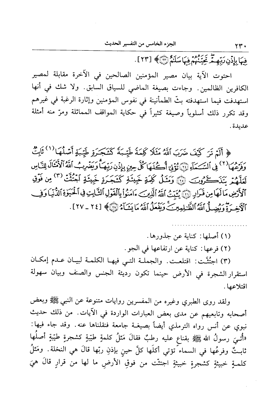 أَلَمْ تَرَ كَيْفَ ضَرَبَ اللَّهُ مَثَلاً كَلِمَةً طَيِّبَةً كَشَجَرَةٍ طَيِّبَةٍ أَصْلُها ثابِتٌ وَفَرْعُها فِي السَّماءِ (24) تُؤْتِي أُكُلَها كُلَّ حِينٍ بِإِذْنِ رَبِّها وَيَضْرِبُ اللَّهُ الْأَمْثالَ لِلنَّاسِ لَعَلَّهُمْ يَتَذَكَّرُونَ (25) وَمَثَلُ كَلِمَةٍ خَبِيثَةٍ كَشَجَرَةٍ خَبِيثَةٍ اجْتُثَّتْ مِنْ فَوْقِ الْأَرْضِ ما لَها مِنْ قَرارٍ (26) يُثَبِّتُ اللَّهُ الَّذِينَ آمَنُوا بِالْقَوْلِ الثَّابِتِ فِي الْحَياةِ الدُّنْيا وَفِي الْآخِرَةِ وَيُضِلُّ اللَّهُ الظَّالِمِينَ وَيَفْعَلُ اللَّهُ ما يَشاءُ (27)