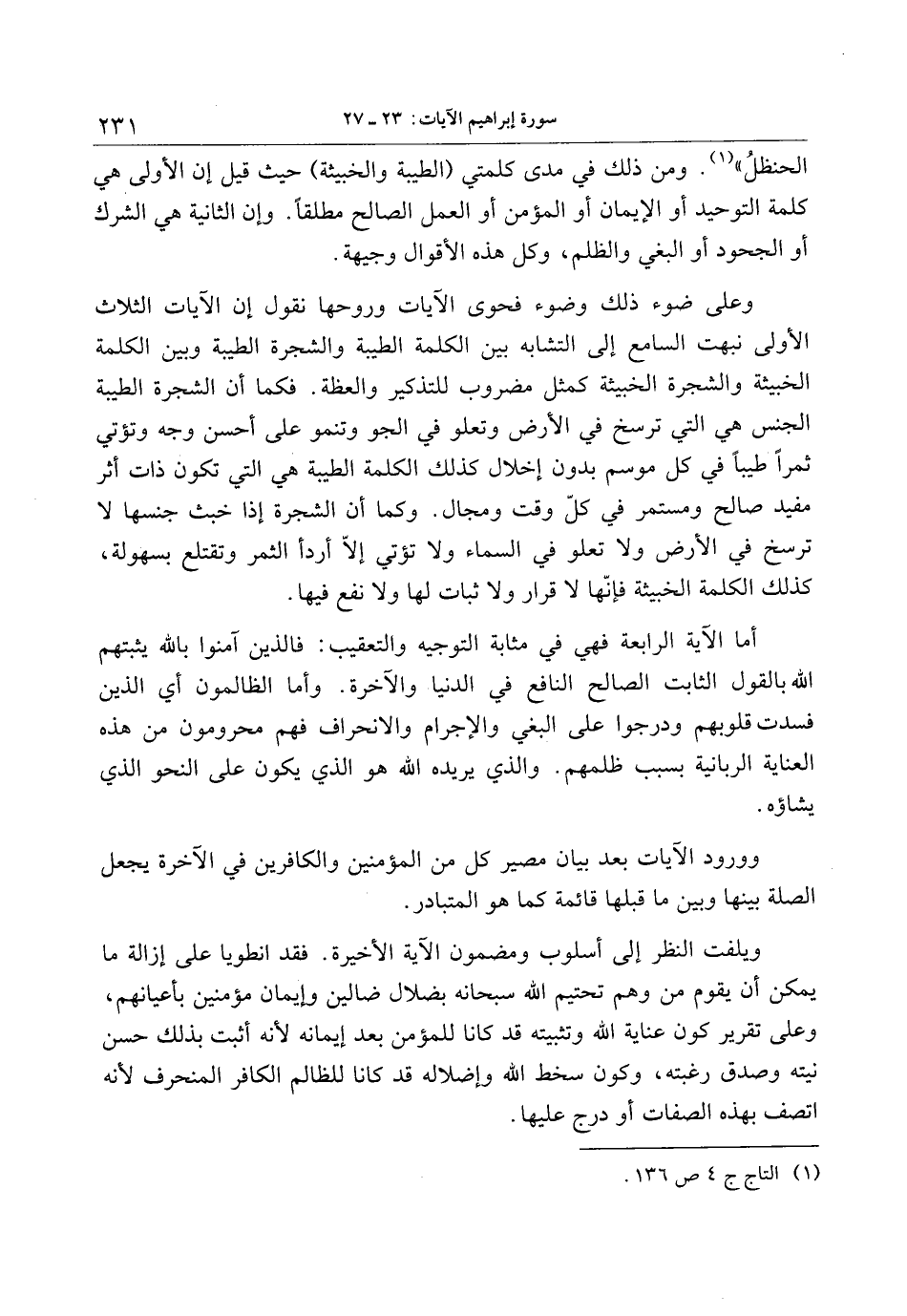 الحنظل» «1» . ومن ذلك في مدى كلمتي (الطيبة والخبيثة) حيث قيل إن الأولى هي كلمة التوحيد أو الإيمان أو المؤمن أو العمل الصالح مطلقا. وإن الثانية هي الشرك أو الجحود أو البغي والظلم، وكل هذه الأقوال وجيهة.
