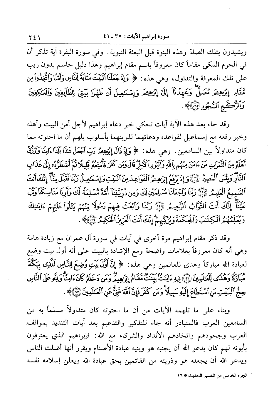 وقد جاء بعد هذه الآية آيات تحكي خبر دعاء إبراهيم لأجل أمن البيت وأهله وخبر رفعه مع إسماعيل لقواعده ودعائهما لذريتهما بأسلوب يلهم أن ما احتوته مما كان متداولا بين السامعين. وهي هذه: وَإِذْ قالَ إِبْراهِيمُ رَبِّ اجْعَلْ هذا بَلَداً آمِناً وَارْزُقْ أَهْلَهُ مِنَ الثَّمَراتِ مَنْ آمَنَ مِنْهُمْ بِاللَّهِ وَالْيَوْمِ الْآخِرِ قالَ وَمَنْ كَفَرَ فَأُمَتِّعُهُ قَلِيلًا ثُمَّ أَضْطَرُّهُ إِلى عَذابِ النَّارِ وَبِئْسَ الْمَصِيرُ (126) وَإِذْ يَرْفَعُ إِبْراهِيمُ الْقَواعِدَ مِنَ الْبَيْتِ وَإِسْماعِيلُ رَبَّنا تَقَبَّلْ مِنَّا إِنَّكَ أَنْتَ السَّمِيعُ الْعَلِيمُ (127) رَبَّنا وَاجْعَلْنا مُسْلِمَيْنِ لَكَ وَمِنْ ذُرِّيَّتِنا أُمَّةً مُسْلِمَةً لَكَ وَأَرِنا مَناسِكَنا وَتُبْ عَلَيْنا إِنَّكَ أَنْتَ التَّوَّابُ الرَّحِيمُ (128) رَبَّنا وَابْعَثْ فِيهِمْ رَسُولًا مِنْهُمْ يَتْلُوا عَلَيْهِمْ آياتِكَ وَيُعَلِّمُهُمُ الْكِتابَ وَالْحِكْمَةَ وَيُزَكِّيهِمْ إِنَّكَ أَنْتَ الْعَزِيزُ الْحَكِيمُ