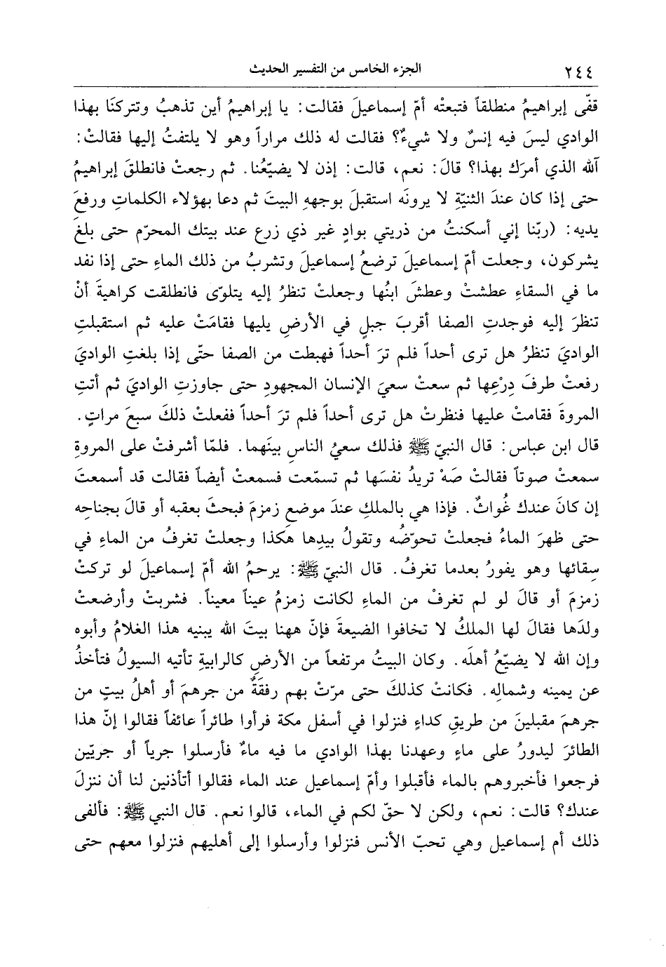 حتى بلغ يَشْكُرُونَ، وجعلت أمّ إسماعيل ترضع إسماعيل وتشرب من ذلك الماء حتى إذا نفد ما في السقاء عطشت وعطش ابنها وجعلت تنظر إليه يتلوّى فانطلقت كراهية أن تنظر إليه فوجدت الصفا أقرب جبل في الأرض يليها فقامت عليه ثم استقبلت الواد تنظر هل ترى أحدا فلم تر أحدا فهبطت من الصفا حتّى إذا بلغت الواد رفعت طرف درعها ثم سعت سعي الإنسان المجهود حتى جاوزت الواد ثم أتت المروة فقامت عليها فنظرت هل ترى أحدا فلم تر أحدا ففعلت ذلك سبع مرات.