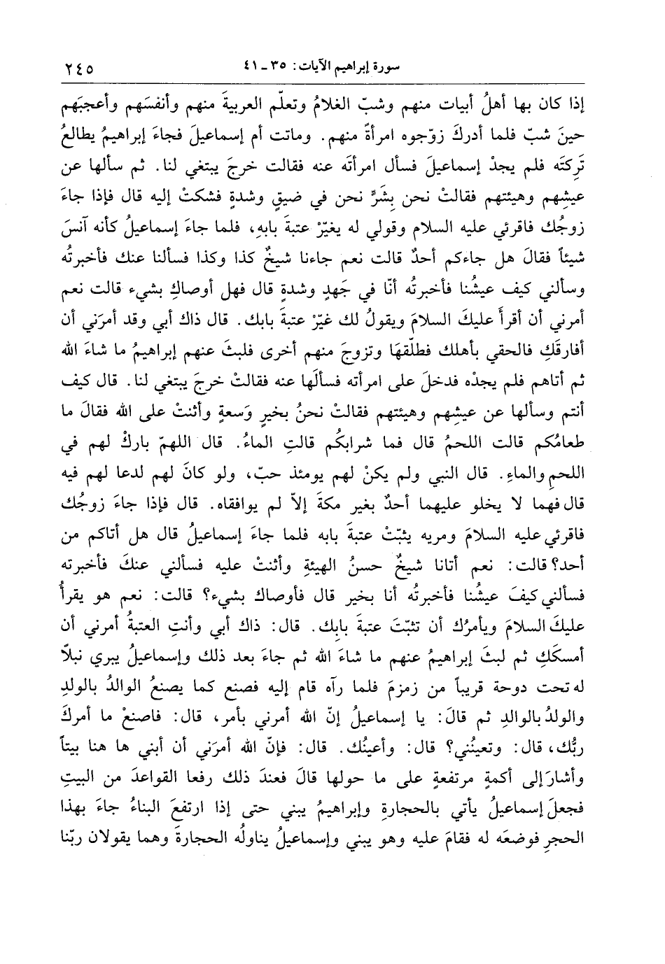 إذا كان بها أهل أبيات منهم وشبّ الغلام وتعلّم العربية منهم وأنفسهم وأعجبهم حين شبّ فلما أدرك زوّجوه امرأت منهم. وماتت أم إسماعيل فجاء إبراهيم يطالع تركته فلم يجد إسماعيل فسأل امرأته عنه فقالت خرج يبتغي لنا. ثم سألها عن عيشهم وهيئتهم فقالت نحن بشرّ نحن في ضيق وشدة فشكت إليه قال فإذا جاء زوجك فاقرئي عليه السلام وقولي له يغيّر عتبة بابه، فلما جاء إسماعيل كأنه انس شيئا فقال هل جاءكم أحد قالت نعم جاءنا شيخ كذا وكذا فسألنا عنك فأخبرته وسألني كيف عيشنا فأخبرته أنّا في جهد وشدة قال فهل أوصاك بشيء قالت نعم أمرني أن أقرأ عليك السلام ويقول لك غيّر عتبة بابك. قال ذاك أبي وقد أمرني أن أفارقك فالحقي بأهلك فطلّقها وتزوج منهم أخرى فلبث عنهم إبراهيم ما شاء الله ثم أتاهم فلم يجده فدخل على امرأته فسألها عنه فقالت خرج يبتغي لنا. قال كيف أنتم وسألها عن عيشهم وهيئتهم فقالت نحن بخير وسعة وأثنت على الله فقال ما طعامكم قالت اللحم قال فما شرابكم قالت الماء. قال اللهمّ بارك لهم في اللحم والماء. قال النبي ولم يكن لهم يومئذ حبّ، ولو كان لهم لدعا لهم فيه قال فهما لا يخلو عليهما أحد بغير مكة إلّا لم يوافقاه. قال فإذا جاء زوجك فاقرئي عليه السلام ومريه يثبّت عتبة بابه فلما جاء إسماعيل قال هل أتاكم من أحد؟ قالت: نعم أتانا شيخ حسن الهيئة وأثنت عليه فسألني عنك فأخبرته فسألني كيف عيشنا فأخبرته أنا بخير قال فأوصاك بشيء؟ قالت: نعم هو يقرأ عليك السلام ويأمرك أن تثبّت عتبة بابك. قال: ذاك أبي وأنت العتبة أمرني أن أمسكك ثم لبث إبراهيم عنهم ما شاء الله ثم جاء بعد ذلك وإسماعيل يبري نبلا له تحت دوحة قريبا من زمزم فلما رآه قام إليه فصنع كما يصنع الوالد بالولد والولد بالوالد ثم قال: يا إسماعيل إنّ الله أمرني بأمر، قال: فاصنع ما أمرك ربّك، قال: وتعينني؟ قال: وأعينك. قال: فإنّ الله أمرني أن أبني هاهنا بيتا وأشار إلى أكمة مرتفعة على ما حولها قال فعند ذلك رفعا القواعد من البيت فجعل إسماعيل يأتي بالحجارة وإبراهيم يا بني حتى إذا ارتفع البناء جاء بهذا الحجر فوضعه له فقام عليه وهو يا بني وإسماعيل يناوله الحجارة وهما يقولان ربّنا