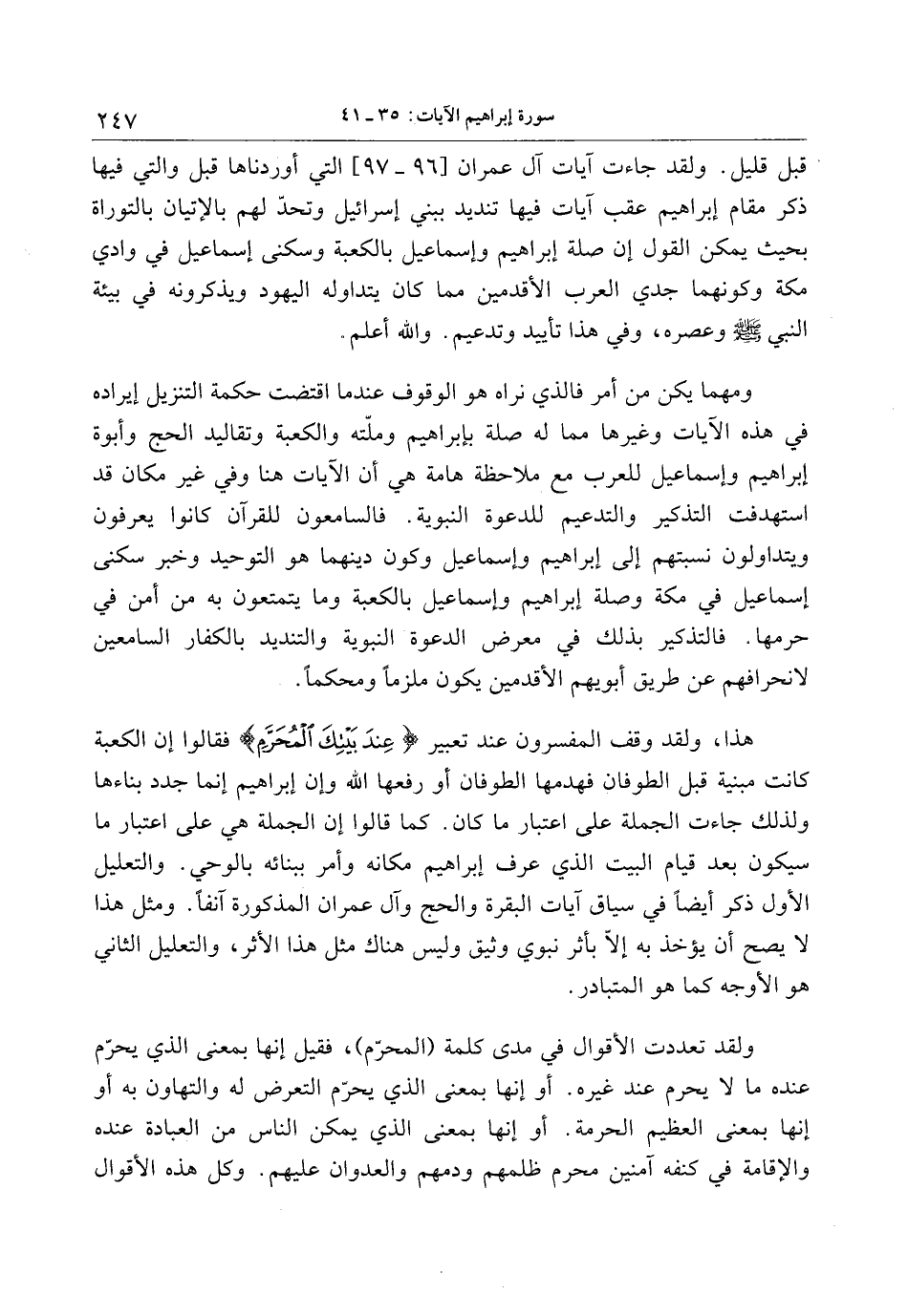 ومهما يكن من أمر فالذي نراه هو الوقوف عند ما اقتضت حكمة التنزيل إيراده في هذه الآيات وغيرها مما له صلة بإبراهيم وملّته والكعبة وتقاليد الحج وأبوة إبراهيم وإسماعيل للعرب مع ملاحظة هامة هي أن الآيات هنا وفي غير مكان قد استهدفت التذكير والتدعيم للدعوة النبوية. فالسامعون للقرآن كانوا يعرفون ويتداولون نسبتهم إلى إبراهيم وإسماعيل وكون دينهما هو التوحيد وخبر سكنى إسماعيل في مكة وصلة إبراهيم وإسماعيل بالكعبة وما يتمتعون به من أمن في حرمها. فالتذكير بذلك في معرض الدعوة النبوية والتنديد بالكفار السامعين لانحرافهم عن طريق أبويهم الأقدمين يكون ملزما ومحكما.