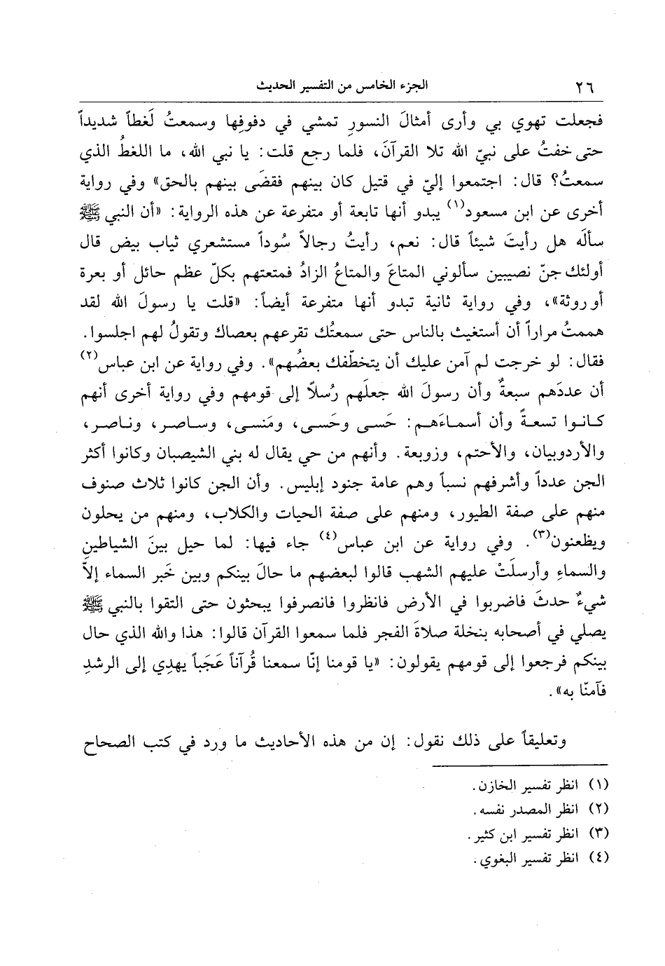 فجعلت تهوي بي وأرى أمثال النسور تمشي في دفوفها وسمعت لغطا شديدا حتى خفت على نبيّ الله تلا القرآن، فلما رجع قلت: يا نبي الله، ما اللغط الذي سمعت؟ قال: اجتمعوا إليّ في قتيل كان بينهم فقضى بينهم بالحق» وفي رواية أخرى عن ابن مسعود «1» يبدو أنها تابعة أو متفرعة عن هذه الرواية: «أن النبي صلى الله عليه وسلم سأله هل رأيت شيئا قال: نعم، رأيت رجالا سودا مستشعري ثياب بيض قال أولئك جنّ نصيبين سألوني المتاع والمتاع الزاد فمتعتهم بكلّ عظم حائل أو بعرة أو روثة» ، وفي رواية ثانية تبدو أنها متفرعة أيضا: «قلت يا رسول الله لقد هممت مرارا أن أستغيث بالناس حتى سمعتك تقرعهم بعصاك وتقول لهم اجلسوا.