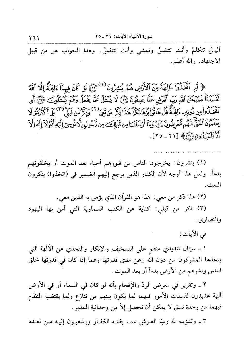 أَمِ اتَّخَذُوا آلِهَةً مِنَ الْأَرْضِ هُمْ يُنْشِرُونَ (21) لَوْ كانَ فِيهِما آلِهَةٌ إِلاَّ اللَّهُ لَفَسَدَتا فَسُبْحانَ اللَّهِ رَبِّ الْعَرْشِ عَمَّا يَصِفُونَ (22) لا يُسْئَلُ عَمَّا يَفْعَلُ وَهُمْ يُسْئَلُونَ (23) أَمِ اتَّخَذُوا مِنْ دُونِهِ آلِهَةً قُلْ هاتُوا بُرْهانَكُمْ هذا ذِكْرُ مَنْ مَعِيَ وَذِكْرُ مَنْ قَبْلِي بَلْ أَكْثَرُهُمْ لا يَعْلَمُونَ الْحَقَّ فَهُمْ مُعْرِضُونَ (24) وَما أَرْسَلْنا مِنْ قَبْلِكَ مِنْ رَسُولٍ إِلاَّ نُوحِي إِلَيْهِ أَنَّهُ لا إِلهَ إِلاَّ أَنَا فَاعْبُدُونِ (25)