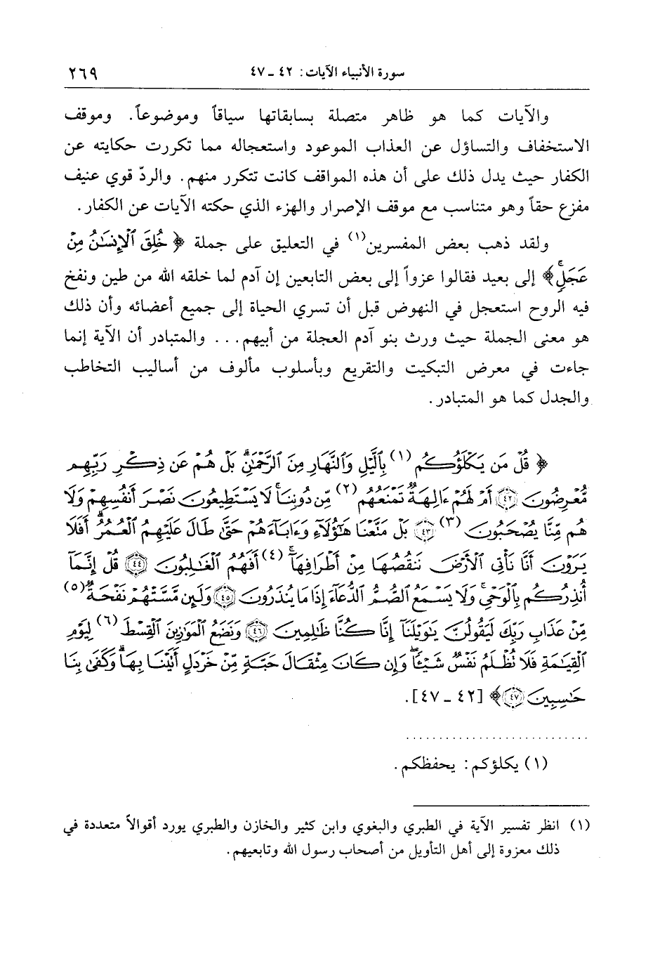 قُلْ مَنْ يَكْلَؤُكُمْ بِاللَّيْلِ وَالنَّهارِ مِنَ الرَّحْمنِ بَلْ هُمْ عَنْ ذِكْرِ رَبِّهِمْ مُعْرِضُونَ (42) أَمْ لَهُمْ آلِهَةٌ تَمْنَعُهُمْ مِنْ دُونِنا لا يَسْتَطِيعُونَ نَصْرَ أَنْفُسِهِمْ وَلا هُمْ مِنَّا يُصْحَبُونَ (43) بَلْ مَتَّعْنا هؤُلاءِ وَآباءَهُمْ حَتَّى طالَ عَلَيْهِمُ الْعُمُرُ أَفَلا يَرَوْنَ أَنَّا نَأْتِي الْأَرْضَ نَنْقُصُها مِنْ أَطْرافِها أَفَهُمُ الْغالِبُونَ (44) قُلْ إِنَّما أُنْذِرُكُمْ بِالْوَحْيِ وَلا يَسْمَعُ الصُّمُّ الدُّعاءَ إِذا ما يُنْذَرُونَ (45) وَلَئِنْ مَسَّتْهُمْ نَفْحَةٌ مِنْ عَذابِ رَبِّكَ لَيَقُولُنَّ يا وَيْلَنا إِنَّا كُنَّا ظالِمِينَ (46)