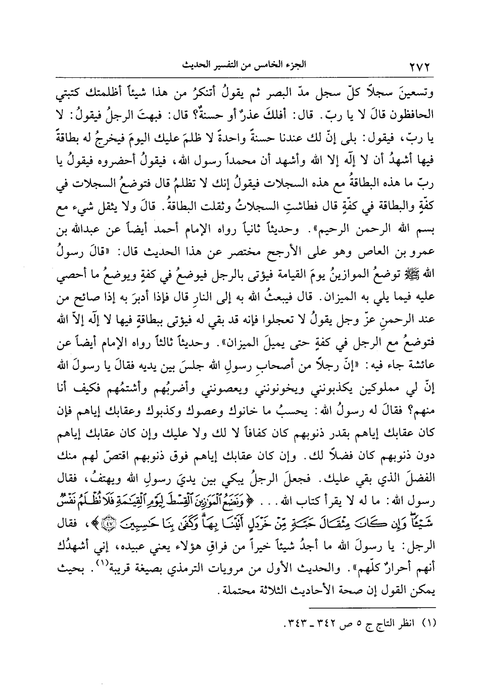 وتسعين سجلا كلّ سجل مدّ البصر ثم يقول أتنكر من هذا شيئا أظلمتك كتبتي الحافظون قال لا يا ربّ. قال: أفلك عذر أو حسنة؟ قال: فبهت الرجل فيقول: لا يا ربّ، فيقول: بلى إنّ لك عندنا حسنة واحدة لا ظلم عليك اليوم فيخرج له بطاقة فيها أشهد أن لا إله إلا الله وأشهد أن محمدا رسول الله، فيقول أحضروه فيقول يا ربّ ما هذه البطاقة مع هذه السجلات فيقول إنك لا تظلم قال فتوضع السجلات في كفّة والبطاقة في كفّة قال فطاشت السجلات وثقلت البطاقة. قال ولا يثقل شيء مع بسم الله الرّحمن الرّحيم» . وحديثا ثانيا رواه الإمام أحمد أيضا عن عبد الله بن عمرو بن العاص وهو على الأرجح مختصر عن هذا الحديث قال: «قال رسول الله صلى الله عليه وسلم توضع الموازين يوم القيامة فيؤتى بالرجل فيوضع في كفة ويوضع ما أحصي عليه فيما يلي به الميزان. قال فيبعث الله به إلى النار قال فإذا أدبر به إذا صائح من عند الرّحمن عزّ وجل يقول لا تعجلوا فإنه قد بقي له فيؤتى ببطاقة فيها لا إله إلّا الله فتوضع مع الرجل في كفة حتى يميل الميزان» . وحديثا ثالثا رواه الإمام أيضا عن عائشة جاء فيه: «إنّ رجلا من أصحاب رسول الله جلس بين يديه فقال يا رسول الله إنّ لي مملوكين يكذبونني ويخونونني ويعصونني وأضربهم وأشتمهم فكيف أنا منهم؟ فقال له رسول الله: يحسب ما خانوك وعصوك وكذبوك وعقابك إياهم فإن كان عقابك إياهم بقدر ذنوبهم كان كفافا لا لك ولا عليك وإن كان عقابك إياهم دون ذنوبهم كان فضلا لك. وإن كان عقابك إياهم فوق ذنوبهم اقتصّ لهم منك الفضل الذي بقي عليك. فجعل الرجل يبكي بين يدي رسول الله ويهتف، فقال رسول الله: ما له لا يقرأ كتاب الله ... وَنَضَعُ الْمَوازِينَ الْقِسْطَ لِيَوْمِ الْقِيامَةِ فَلا تُظْلَمُ نَفْسٌ شَيْئاً وَإِنْ كانَ مِثْقالَ حَبَّةٍ مِنْ خَرْدَلٍ أَتَيْنا بِها وَكَفى بِنا حاسِبِينَ (47) ، فقال الرجل: يا رسول الله ما أجد شيئا خيرا من فراق هؤلاء يعني عبيده، إني أشهدك أنهم أحرار كلّهم» . والحديث الأول من مرويات الترمذي بصيغة قريبة «1» . بحيث يمكن القول إن صحة الأحاديث الثلاثة محتملة.