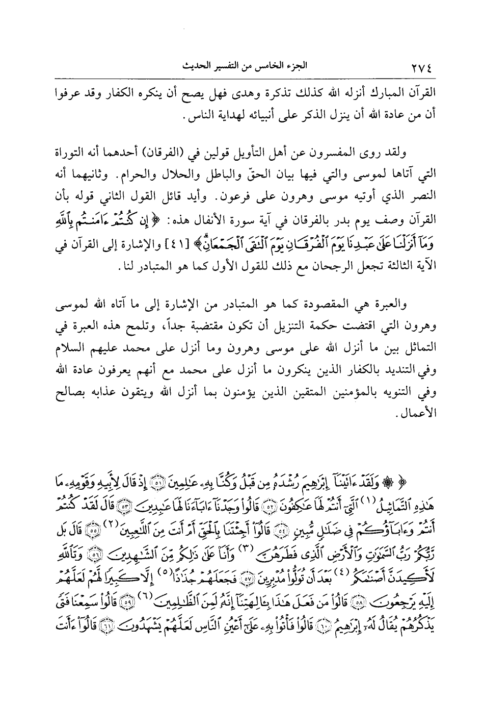 ولقد روى المفسرون عن أهل التأويل قولين في (الفرقان) أحدهما أنه التوراة التي آتاها لموسى والتي فيها بيان الحقّ والباطل والحلال والحرام. وثانيهما أنه النصر الذي أوتيه موسى وهرون على فرعون. وأيد قائل القول الثاني قوله بأن القرآن وصف يوم بدر بالفرقان في آية سورة الأنفال هذه: إِنْ كُنْتُمْ آمَنْتُمْ بِاللَّهِ وَما أَنْزَلْنا عَلى عَبْدِنا يَوْمَ الْفُرْقانِ يَوْمَ الْتَقَى الْجَمْعانِ [41] والإشارة إلى القرآن في الآية الثالثة تجعل الرجحان مع ذلك للقول الأول كما هو المتبادر لنا.