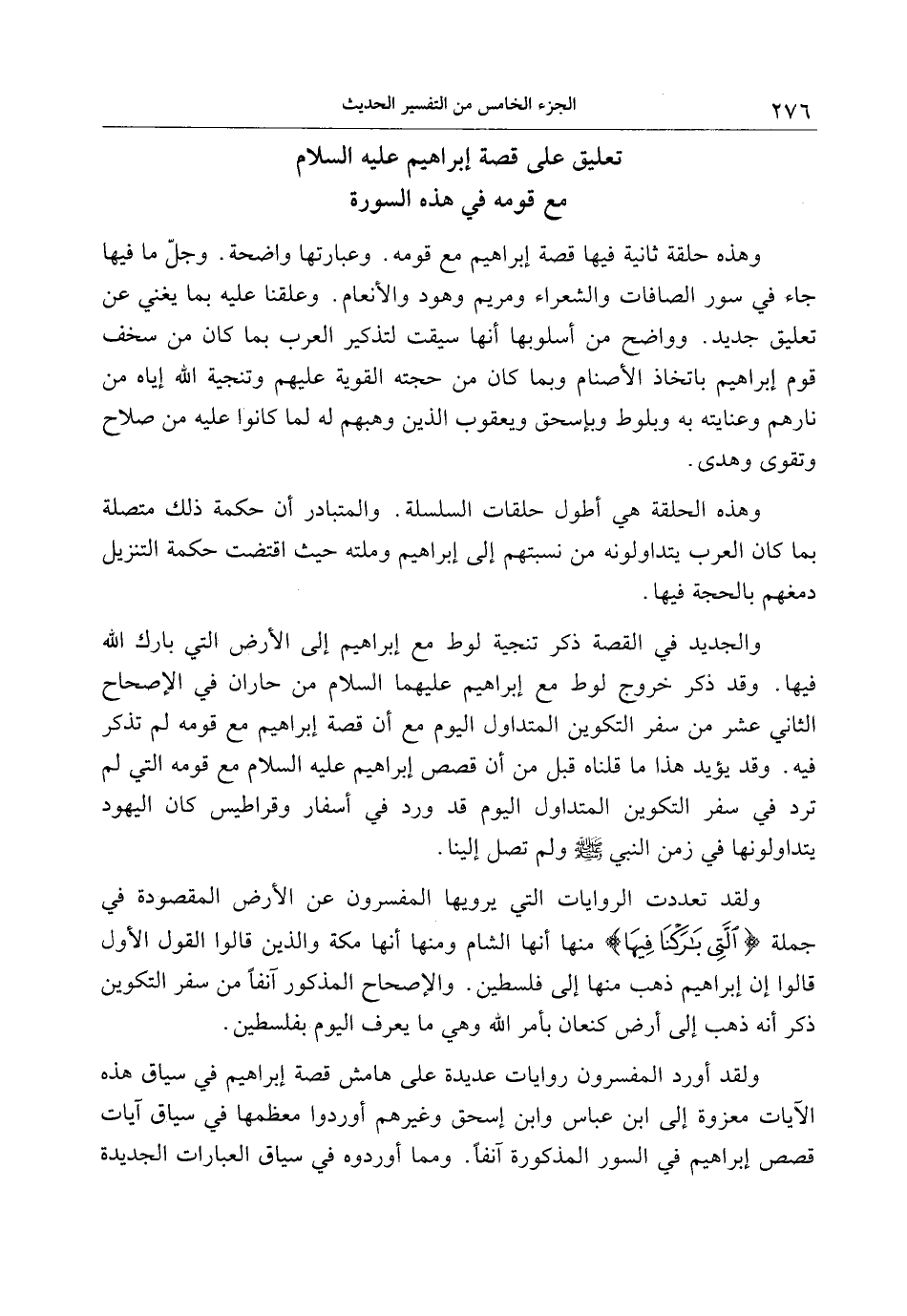 وهذه حلقة ثانية فيها قصة إبراهيم مع قومه. وعبارتها واضحة. وجلّ ما فيها جاء في سور الصافات والشعراء ومريم وهود والأنعام. وعلقنا عليه بما يغني عن تعليق جديد. وواضح من أسلوبها أنها سيقت لتذكير العرب بما كان من سخف قوم إبراهيم باتخاذ الأصنام وبما كان من حجته القوية عليهم وتنجية الله إياه من نارهم وعنايته به وبلوط وبإسحاق ويعقوب الذين وهبهم له لما كانوا عليه من صلاح وتقوى وهدى.