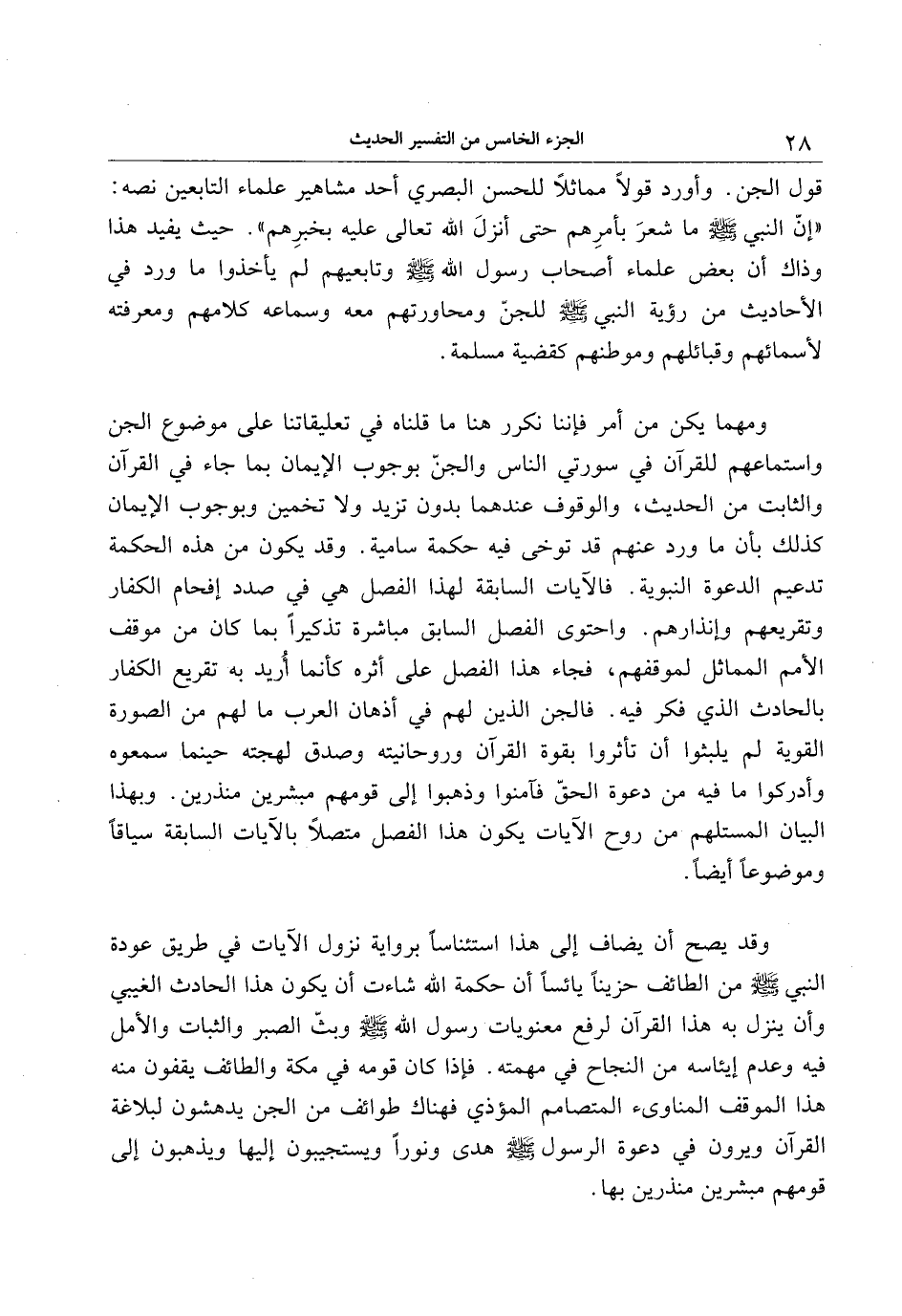 ومهما يكن من أمر فإننا نكرر هنا ما قلناه في تعليقاتنا على موضوع الجن واستماعهم للقرآن في سورتي الناس والجنّ بوجوب الإيمان بما جاء في القرآن والثابت من الحديث، والوقوف عندهما بدون تزيد ولا تخمين وبوجوب الإيمان كذلك بأن ما ورد عنهم قد توخى فيه حكمة سامية. وقد يكون من هذه الحكمة تدعيم الدعوة النبوية. فالآيات السابقة لهذا الفصل هي في صدد إفحام الكفار وتقريعهم وإنذارهم. واحتوى الفصل السابق مباشرة تذكيرا بما كان من موقف الأمم المماثل لموقفهم، فجاء هذا الفصل على أثره كأنما أريد به تقريع الكفار بالحادث الذي فكر فيه. فالجن الذين لهم في أذهان العرب ما لهم من الصورة القوية لم يلبثوا أن تأثروا بقوة القرآن وروحانيته وصدق لهجته حينما سمعوه وأدركوا ما فيه من دعوة الحقّ فآمنوا وذهبوا إلى قومهم مبشرين منذرين. وبهذا البيان المستلهم من روح الآيات يكون هذا الفصل متصلا بالآيات السابقة سياقا وموضوعا أيضا.
