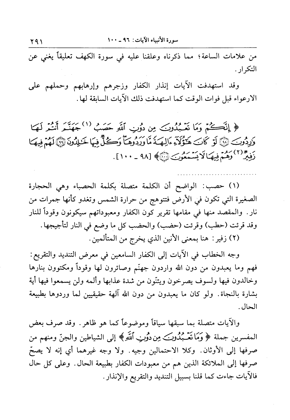. (1) حصب: الواضح أن الكلمة متصلة بكلمة الحصباء وهي الحجارة الصغيرة التي تكون في الأرض فتتوهج من حرارة الشمس وتغدو كأنها جمرات من نار. والمقصد منها في مقامها تقرير كون الكفار ومعبوداتهم سيكونون وقودا للنار وقد قرئت (حطب) وقرئت (حضب) والحضب كل ما وضع في النار لتأجيجها.