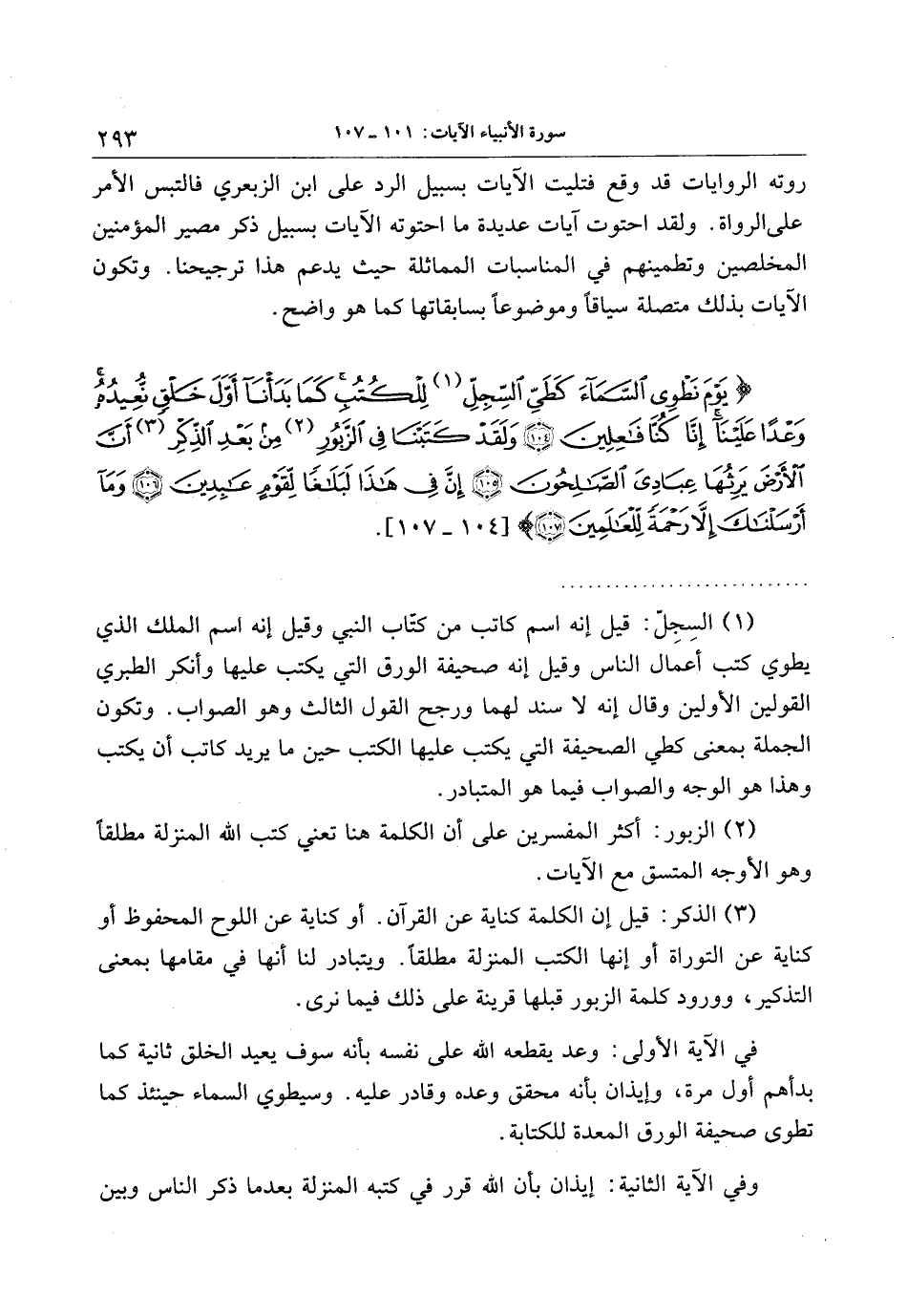 . (1) السجلّ: قيل إنه اسم كاتب من كتّاب النبي وقيل إنه اسم الملك الذي يطوي كتب أعمال الناس وقيل إنه صحيفة الورق التي يكتب عليها وأنكر الطبري القولين الأولين وقال إنه لا سند لهما ورجح القول الثالث وهو الصواب. وتكون الجملة بمعنى كطي الصحيفة التي يكتب عليها الكتب حين ما يريد كاتب أن يكتب وهذا هو الوجه والصواب فيما هو المتبادر.