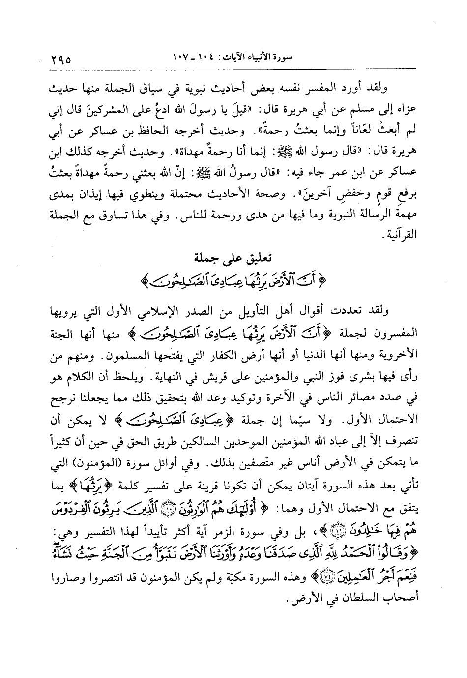 ولقد تعددت أقوال أهل التأويل من الصدر الإسلامي الأول التي يرويها المفسرون لجملة أَنَّ الْأَرْضَ يَرِثُها عِبادِيَ الصَّالِحُونَ منها أنها الجنة الأخروية ومنها أنها الدنيا أو أنها أرض الكفار التي يفتحها المسلمون. ومنهم من رأى فيها بشرى فوز النبي والمؤمنين على قريش في النهاية. ويلحظ أن الكلام هو في صدد مصائر الناس في الآخرة وتوكيد وعد الله بتحقيق ذلك مما يجعلنا نرجح الاحتمال الأول. ولا سيّما إن جملة عِبادِيَ الصَّالِحُونَ لا يمكن أن تنصرف إلّا إلى عباد الله المؤمنين الموحدين السالكين طريق الحق في حين أن كثيرا ما يتمكن في الأرض أناس غير متّصفين بذلك. وفي أوائل سورة (المؤمنون) التي تأتي بعد هذه السورة آيتان يمكن أن تكونا قرينة على تفسير كلمة يَرِثُها بما يتفق مع الاحتمال الأول وهما: أُولئِكَ هُمُ الْوارِثُونَ (10) الَّذِينَ يَرِثُونَ الْفِرْدَوْسَ هُمْ فِيها خالِدُونَ (11) ، بل وفي سورة الزمر آية أكثر تأييدا لهذا التفسير وهي: