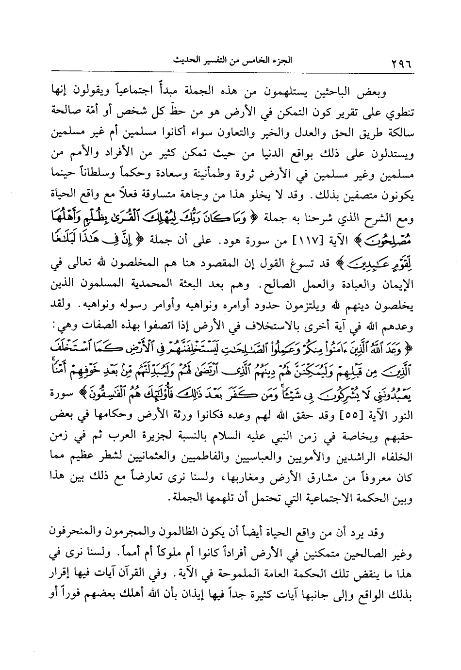 وَعَدَ اللَّهُ الَّذِينَ آمَنُوا مِنْكُمْ وَعَمِلُوا الصَّالِحاتِ لَيَسْتَخْلِفَنَّهُمْ فِي الْأَرْضِ كَمَا اسْتَخْلَفَ الَّذِينَ مِنْ قَبْلِهِمْ وَلَيُمَكِّنَنَّ لَهُمْ دِينَهُمُ الَّذِي ارْتَضى لَهُمْ وَلَيُبَدِّلَنَّهُمْ مِنْ بَعْدِ خَوْفِهِمْ أَمْناً يَعْبُدُونَنِي لا يُشْرِكُونَ بِي شَيْئاً وَمَنْ كَفَرَ بَعْدَ ذلِكَ فَأُولئِكَ هُمُ الْفاسِقُونَ سورة النور الآية [55] وقد حقق الله لهم وعده فكانوا ورثة الأرض وحكامها في بعض حقبهم وبخاصة في زمن النبي عليه السلام بالنسبة لجزيرة العرب ثم في زمن الخلفاء الراشدين والأمويين والعباسيين والفاطميين والعثمانيين لشطر عظيم مما كان معروفا من مشارق الأرض ومغاربها، ولسنا نرى تعارضا مع ذلك بين هذا وبين الحكمة الاجتماعية التي تحتمل أن تلهمها الجملة.