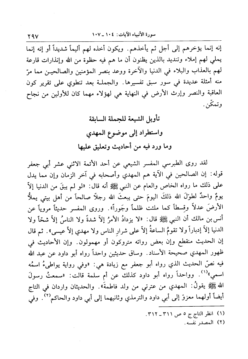 لقد روى الطبرسي المفسر الشيعي عن أحد الأئمة الاثني عشر أبي جعفر قوله: إن الصالحين في الآية هم المهدي وأصحابه في آخر الزمان وإن مما يدل على ذلك ما رواه الخاص والعام عن النبي صلى الله عليه وسلم أنه قال: «لو لم يبق من الدنيا إلّا يوم واحد لطوّل الله ذلك اليوم حتى يبعث الله رجلا صالحا من أهل بيتي يملأ الأرض عدلا وقسطا كما ملئت ظلما وجورا» . وروى المفسر حديثا مرويا عن أنس بن مالك أن النبي صلى الله عليه وسلم قال: «لا يزداد الأمر إلّا شدة ولا الناس إلّا شحّا ولا الدنيا إلّا إدبارا ولا تقوم الساعة إلّا على شرار الناس ولا مهدي إلّا عيسى» . ثم قال إن الحديث منقطع وإن بعض رواته متروكون أو مهمولون. وإن الأحاديث في ظهور المهدي صحيحة الأسناد. وساق حديثين واحدا رواه أبو داود عن عبد الله فيه نصّ الحديث الذي رواه أبو جعفر مع زيادة هي: «وفي رواية يواطىء اسمه اسمي» «1» . وواحدا رواه أبو داود كذلك عن أم سلمة قالت: «سمعت رسول الله صلى الله عليه وسلم يقول: المهدي من عترتي من ولد فاطمة» . والحديثان واردان في التاج أيضا أولهما معزوّ إلى أبي داود والترمذي وثانيهما إلى أبي داود والحاكم «2» . وفي