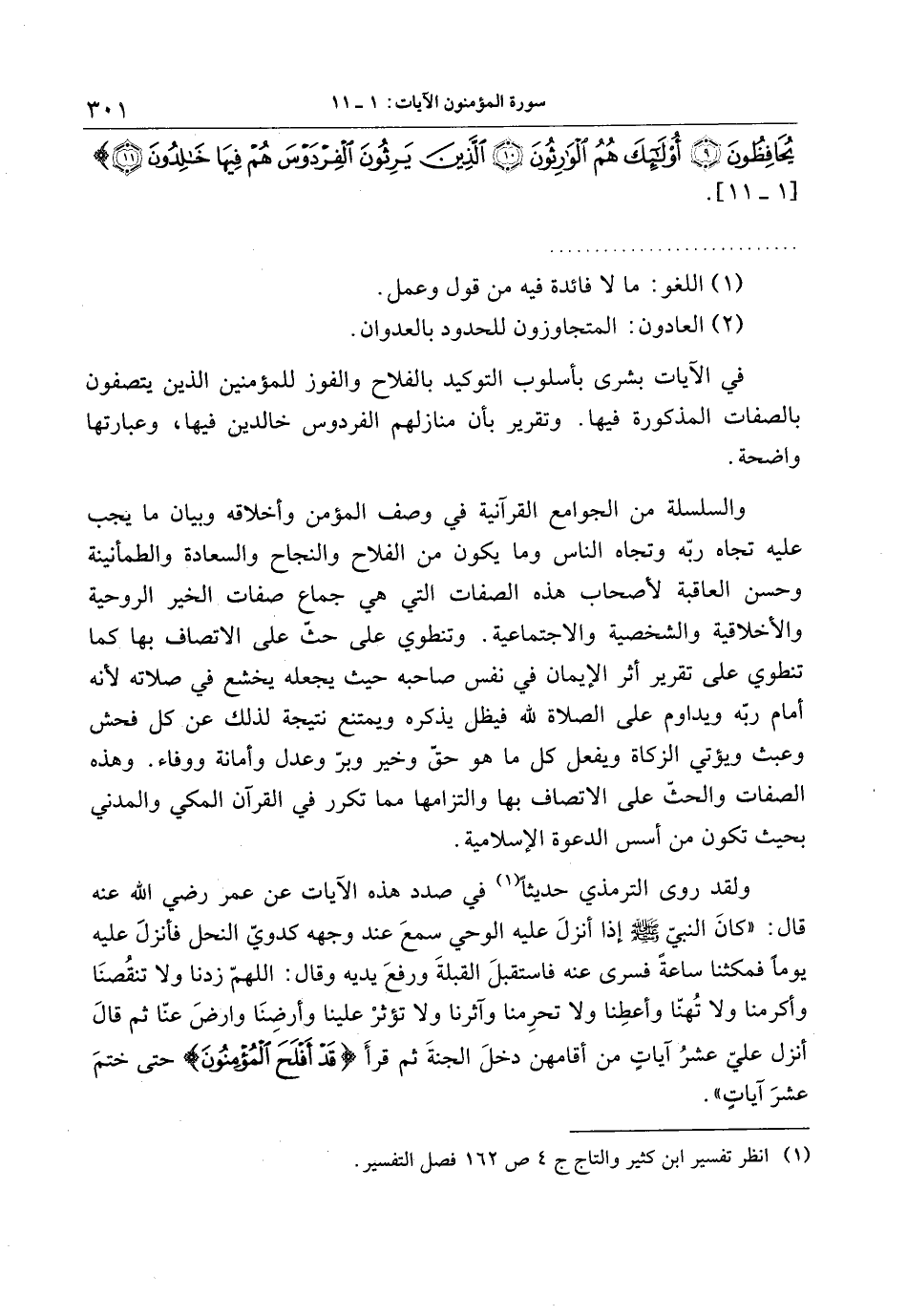 ولقد روى الترمذي حديثا «1» في صدد هذه الآيات عن عمر رضي الله عنه قال: «كان النبيّ صلى الله عليه وسلم إذا أنزل عليه الوحي سمع عند وجهه كدويّ النحل فأنزل عليه يوما فمكثنا ساعة فسرى عنه فاستقبل القبلة ورفع يديه وقال: اللهمّ زدنا ولا تنقصنا وأكرمنا ولا تهنّا وأعطنا ولا تحرمنا وآثرنا ولا تؤثر علينا وأرضنا وارض عنّا ثم قال أنزل عليّ عشر آيات من أقامهن دخل الجنة ثم قرأ قَدْ أَفْلَحَ الْمُؤْمِنُونَ حتى ختم عشر آيات» .