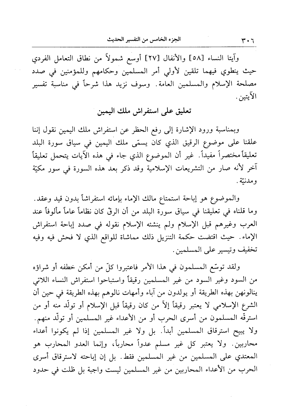 وبمناسبة ورود الإشارة إلى رفع الحظر عن استفراش ملك اليمين نقول إننا علقنا على موضوع الرقيق الذي كان يسمّى ملك اليمين في سياق سورة البلد تعليقا مختصرا مفيدا. غير أن الموضوع الذي جاء في هذه الآيات يتحمل تعليقا آخر لأنه صار من التشريعات الإسلامية وقد ذكر بعد هذه السورة في سور مكيّة ومدنيّة.