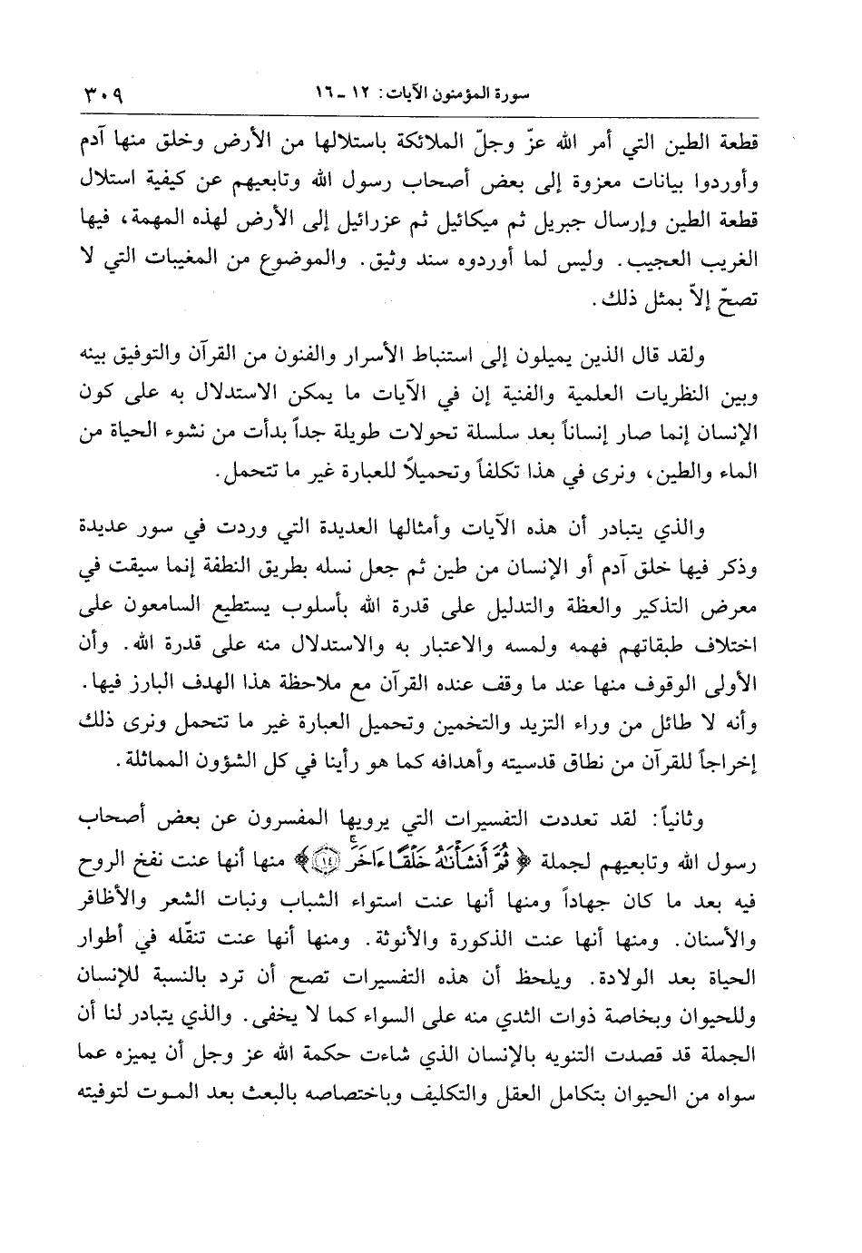 وثانيا: لقد تعددت التفسيرات التي يرويها المفسرون عن بعض أصحاب رسول الله وتابعيهم لجملة ثُمَّ أَنْشَأْناهُ خَلْقاً آخَرَ (14) منها أنها عنت نفخ الروح فيه بعد ما كان جهادا ومنها أنها عنت استواء الشباب ونبات الشعر والأظافر والأسنان. ومنها أنها عنت الذكورة والأنوثة. ومنها أنها عنت تنقّله في أطوار الحياة بعد الولادة. ويلحظ أن هذه التفسيرات تصح أن ترد بالنسبة للإنسان وللحيوان وبخاصة ذوات الثدي منه على السواء كما لا يخفى. والذي يتبادر لنا أن الجملة قد قصدت التنويه بالإنسان الذي شاءت حكمة الله عز وجل أن يميزه عما سواه من الحيوان بتكامل العقل والتكليف وباختصاصه بالبعث بعد الموت لتوفيته