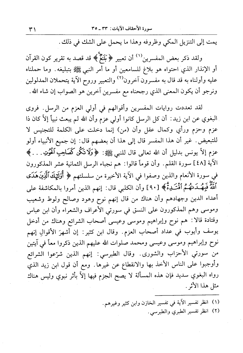 الآية [48] سورة القلم. وأن قوما قالوا: هم نجباء الرسل الثمانية عشر المذكورون في سورة الأنعام والذين وصفوا في الآية الأخيرة من سلسلتهم أُولئِكَ الَّذِينَ هَدَى اللَّهُ فَبِهُداهُمُ اقْتَدِهْ [90] وأن الكلبي قال: إنهم الذين أمروا بالمكاشفة على أعداء الدين وجهادهم وأن هناك من قال إنهم نوح وهود وصالح ولوط وشعيب وموسى وهم المذكورون على النسق في سورتي الأعراف والشعراء وأن ابن عباس وقتادة قالا: هم نوح وإبراهيم وموسى وعيسى أصحاب الشرائع وهناك من أدخل يوسف وأيوب في عداد أصحاب العزم. وقال ابن كثير: إن أشهر الأقوال إنهم نوح وإبراهيم وموسى وعيسى ومحمد صلوات الله عليهم الذين ذكروا معا في آيتين من سورتي الأحزاب والشورى. وقال الطبرسي: إنهم الذين شرّعوا الشرائع وأوجبوا على الناس الأخذ بها والانقطاع عن غيرها. ومع أن قول ابن زيد الذي رواه البغوي سديد فإن هذه المسألة لا يصح الجزم فيها إلّا بأثر نبوي وليس هناك مثل هذا الأثر.
