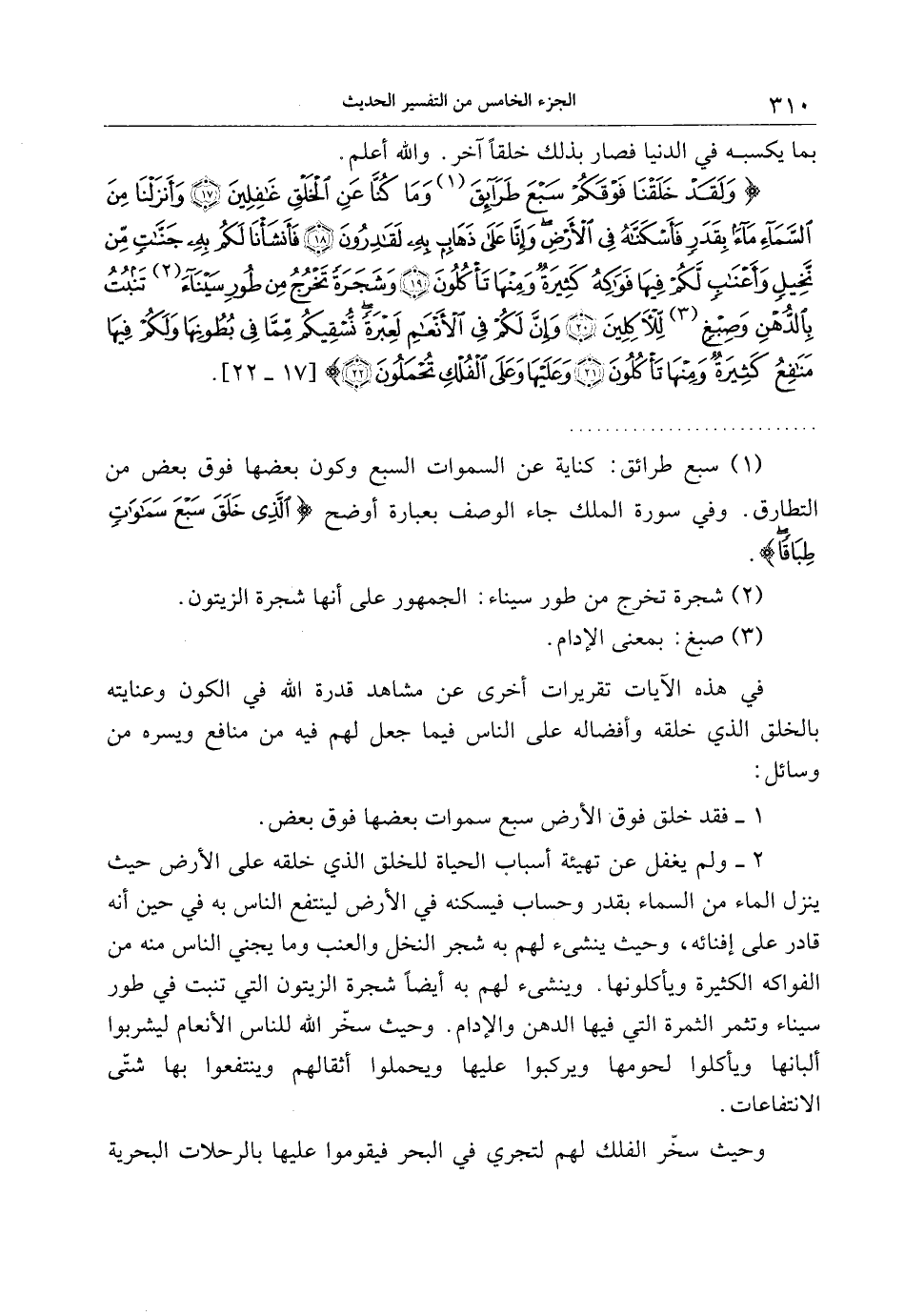 وَلَقَدْ خَلَقْنا فَوْقَكُمْ سَبْعَ طَرائِقَ وَما كُنَّا عَنِ الْخَلْقِ غافِلِينَ (17) وَأَنْزَلْنا مِنَ السَّماءِ ماءً بِقَدَرٍ فَأَسْكَنَّاهُ فِي الْأَرْضِ وَإِنَّا عَلى ذَهابٍ بِهِ لَقادِرُونَ (18) فَأَنْشَأْنا لَكُمْ بِهِ جَنَّاتٍ مِنْ نَخِيلٍ وَأَعْنابٍ لَكُمْ فِيها فَواكِهُ كَثِيرَةٌ وَمِنْها تَأْكُلُونَ (19) وَشَجَرَةً تَخْرُجُ مِنْ طُورِ سَيْناءَ تَنْبُتُ بِالدُّهْنِ وَصِبْغٍ لِلْآكِلِينَ (20) وَإِنَّ لَكُمْ فِي الْأَنْعامِ لَعِبْرَةً نُسْقِيكُمْ مِمَّا فِي بُطُونِها وَلَكُمْ فِيها مَنافِعُ كَثِيرَةٌ وَمِنْها تَأْكُلُونَ (21)