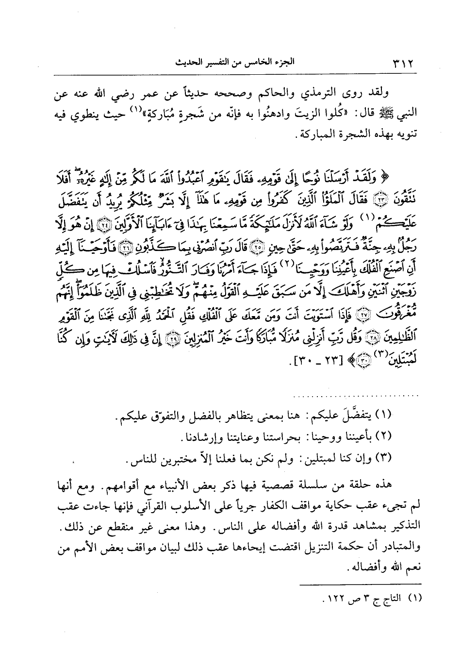 وَلَقَدْ أَرْسَلْنا نُوحاً إِلى قَوْمِهِ فَقالَ يا قَوْمِ اعْبُدُوا اللَّهَ ما لَكُمْ مِنْ إِلهٍ غَيْرُهُ أَفَلا تَتَّقُونَ (23) فَقالَ الْمَلَأُ الَّذِينَ كَفَرُوا مِنْ قَوْمِهِ ما هذا إِلاَّ بَشَرٌ مِثْلُكُمْ يُرِيدُ أَنْ يَتَفَضَّلَ عَلَيْكُمْ وَلَوْ شاءَ اللَّهُ لَأَنْزَلَ مَلائِكَةً ما سَمِعْنا بِهذا فِي آبائِنَا الْأَوَّلِينَ (24) إِنْ هُوَ إِلاَّ رَجُلٌ بِهِ جِنَّةٌ فَتَرَبَّصُوا بِهِ حَتَّى حِينٍ (25) قالَ رَبِّ انْصُرْنِي بِما كَذَّبُونِ (26) فَأَوْحَيْنا إِلَيْهِ أَنِ اصْنَعِ الْفُلْكَ بِأَعْيُنِنا وَوَحْيِنا فَإِذا جاءَ أَمْرُنا وَفارَ التَّنُّورُ فَاسْلُكْ فِيها مِنْ كُلٍّ زَوْجَيْنِ اثْنَيْنِ وَأَهْلَكَ إِلاَّ مَنْ سَبَقَ عَلَيْهِ الْقَوْلُ مِنْهُمْ وَلا تُخاطِبْنِي فِي الَّذِينَ ظَلَمُوا إِنَّهُمْ مُغْرَقُونَ (27)